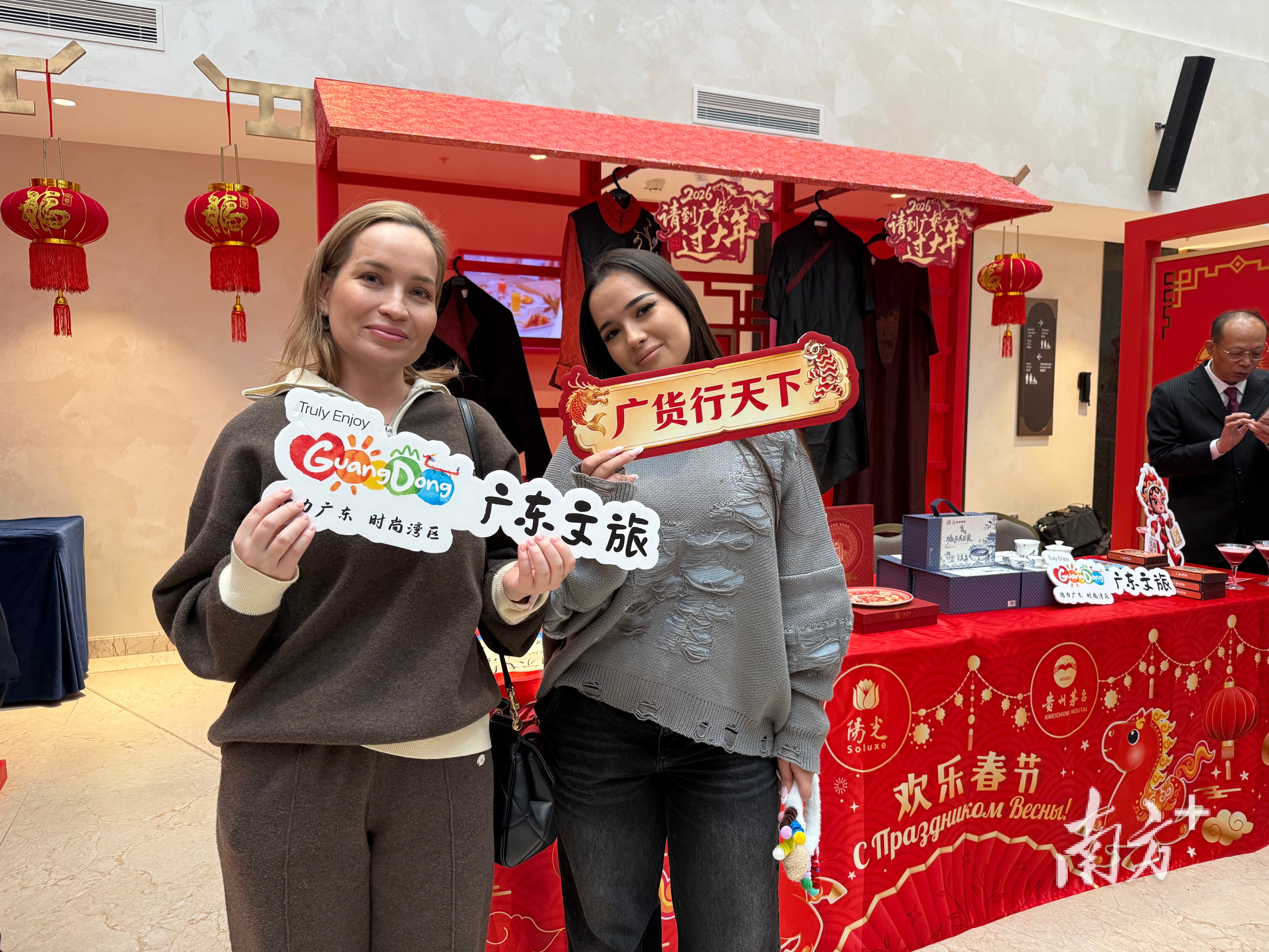 活动现场,中俄两国嘉宾纷至沓来。俄罗斯杜马第一副主席伊万·梅利尼科夫心情激动地敲响英歌鼓点,并为活动发表新年致辞。现年91岁的中华人民共和国“友谊勋章”获得者、俄中友好协会第一副主席加林娜·库利科娃也亲临现场,为广货助力打Call。她表示自己十分喜爱来自广东的香云纱。 不少嘉宾还手持冰箱贴拍照“打卡”。