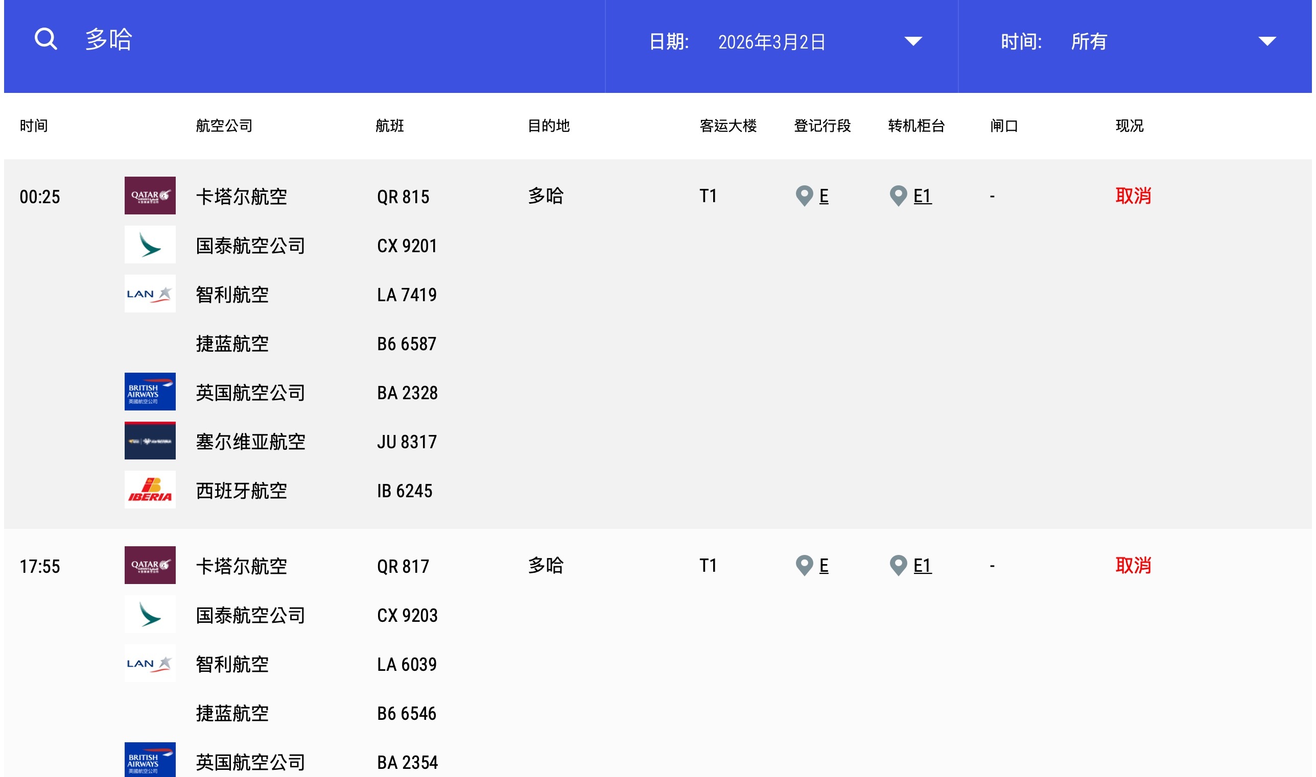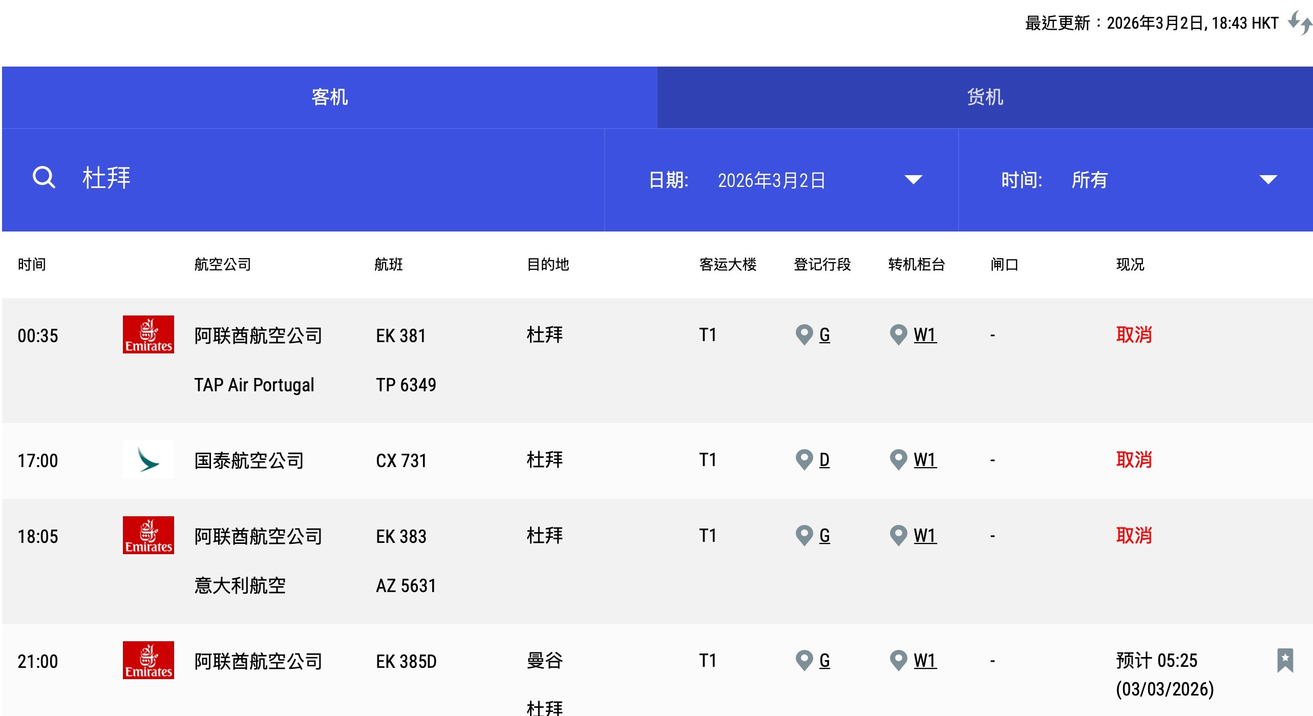 国泰航空宣布,已经取消所有由2月28日至3月3日往返利雅得的航班。已预订3月7日或之前往返香港与迪拜航班的旅客,重新订位、更改航点或退款,都可豁免手续费。其中,3月3日,约10班航班已经确认取消,包括来往迪拜、多哈、阿布扎比及利雅得等地。