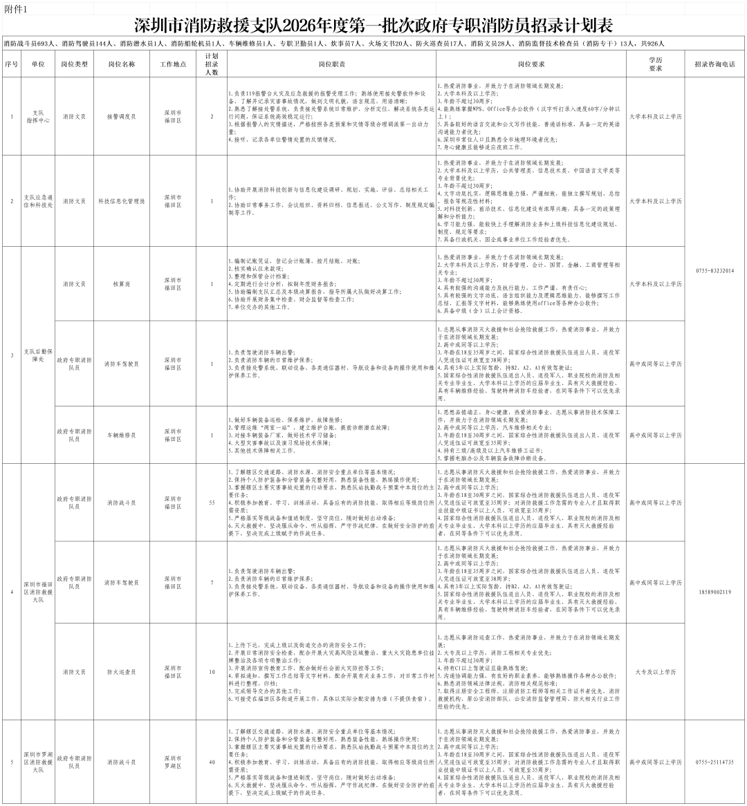 1.深圳市消防救援支队2026年度第一批次政府专职消防员招录计划表