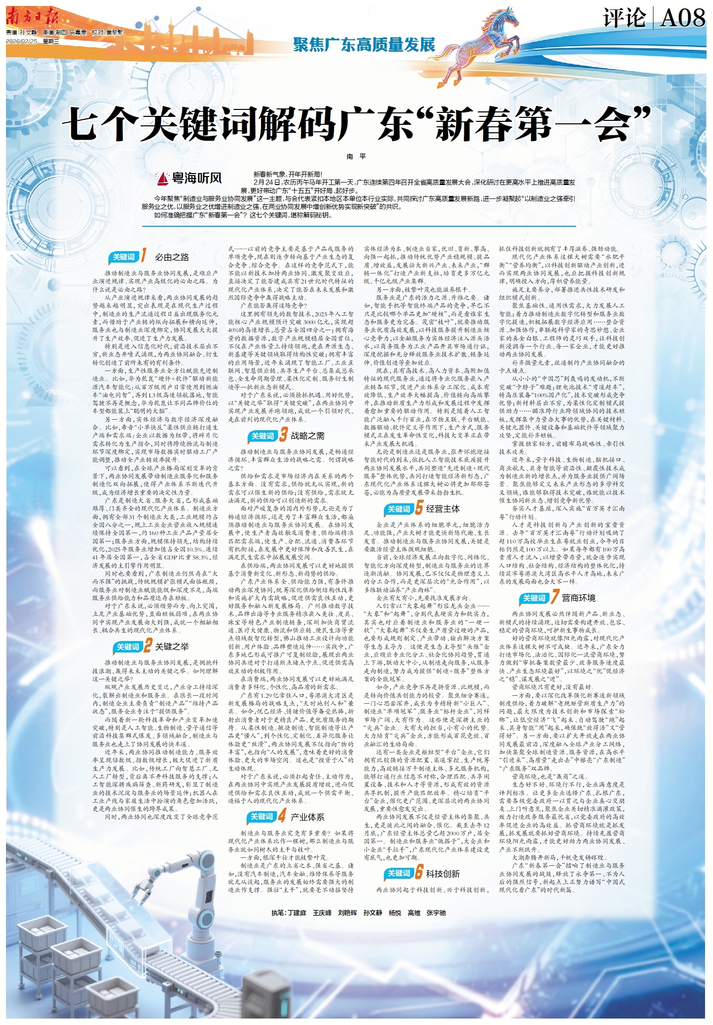 一方面,要以深化改革强化新赛道新领域制度供给,着力破解“老规矩管新质生产力”的问题,最大限度为技术创新和市场探索“松绑”,让低空经济“飞”起来、自动驾驶“跑”起来、具身智能“用”起来,确保既“放得活”又“管得好”。另一方面,要以扩大开放走在两业协同发展最前沿,深度融入全球产业分工网络,加快集聚全球制造资源、服务资源,在高水平“引进来”、高质量“走出去”中擦亮“广东制造”“广东服务”双品牌。