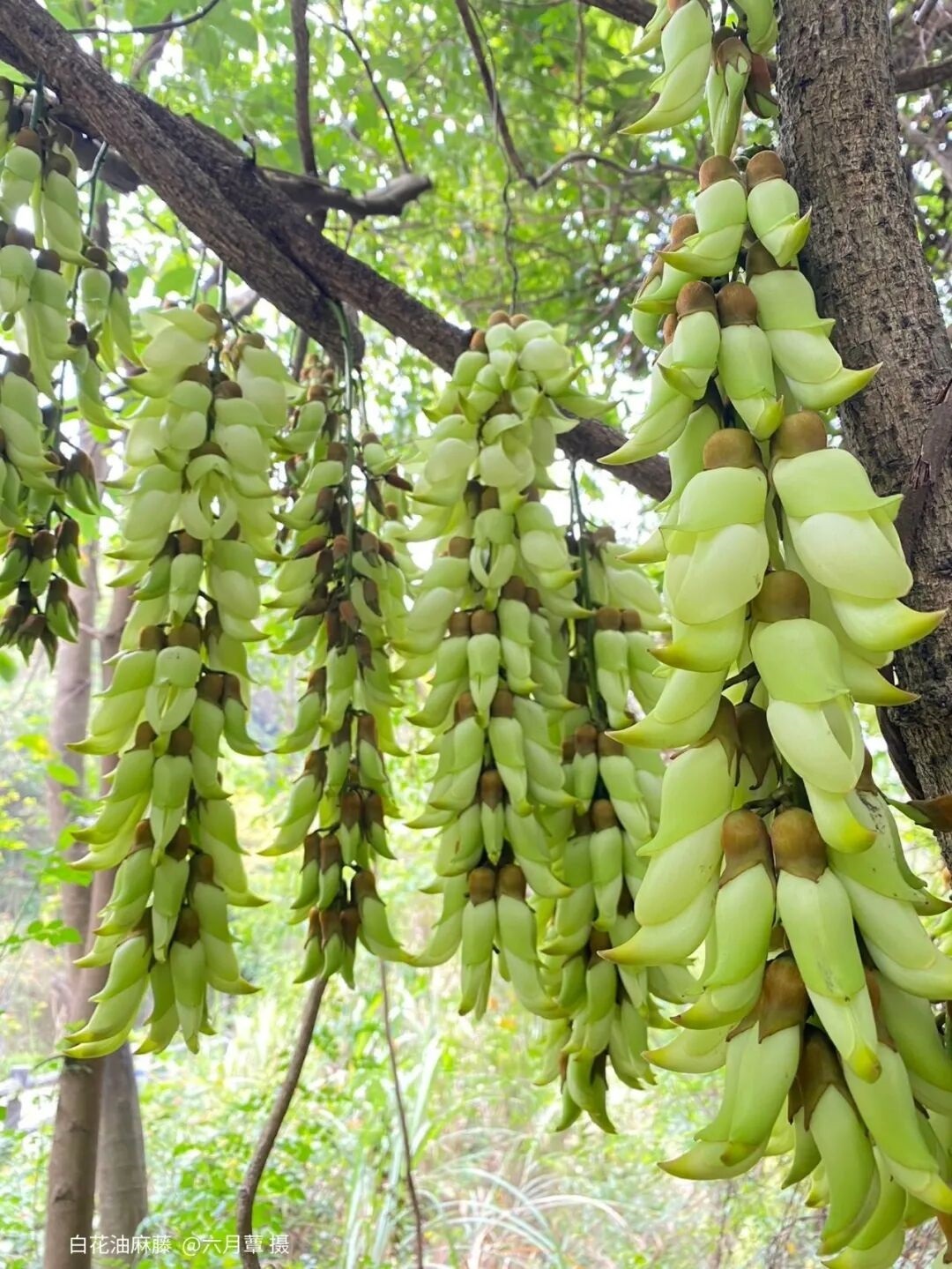 禾雀花,花如其名,花开时如万千雀鸟栖满枝头。常见的禾雀花有绿色的白花油麻藤、紫色的大果油麻藤这两种。从三月上旬开始,一串串花朵绽放在老藤上,尽显山野的壮观与灵动。