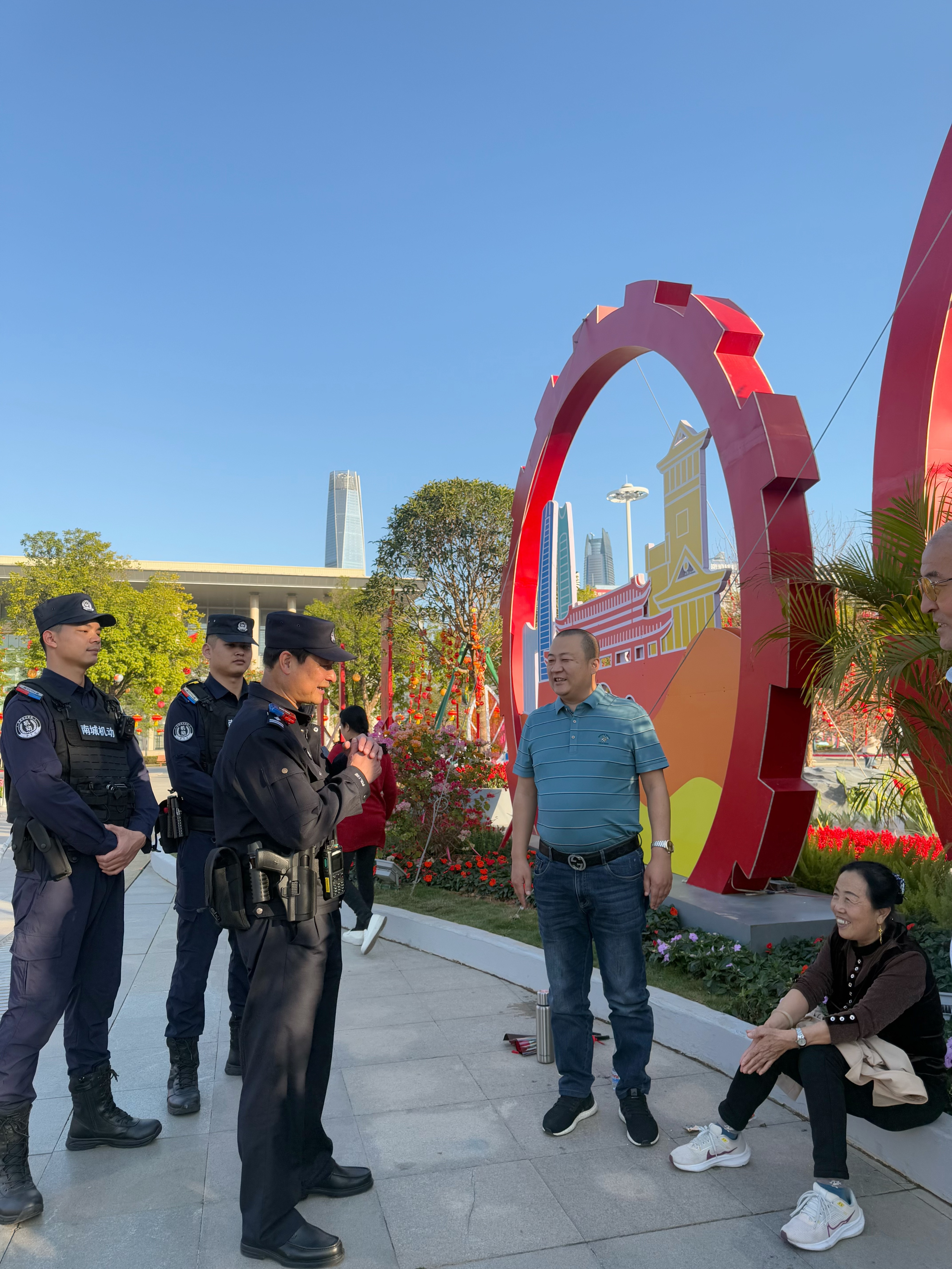 位于南城街道的市行政中心广场莞香雕塑前,鲜花绽放的美景吸引了不少市民留影。从警26年的南城公安分局民警李容水,从军营到警营,他的军人本色从未改变,坚守在中心广场的巡逻岗位上,一句“有我们在,大家放心”,让市民倍感温暖。春节期间,中心广场派出所54名民辅警全员值守,白天15个巡组驻守,夜晚5个巡组坚守,20人机动队随时待命,用满格警力守护城市地标。