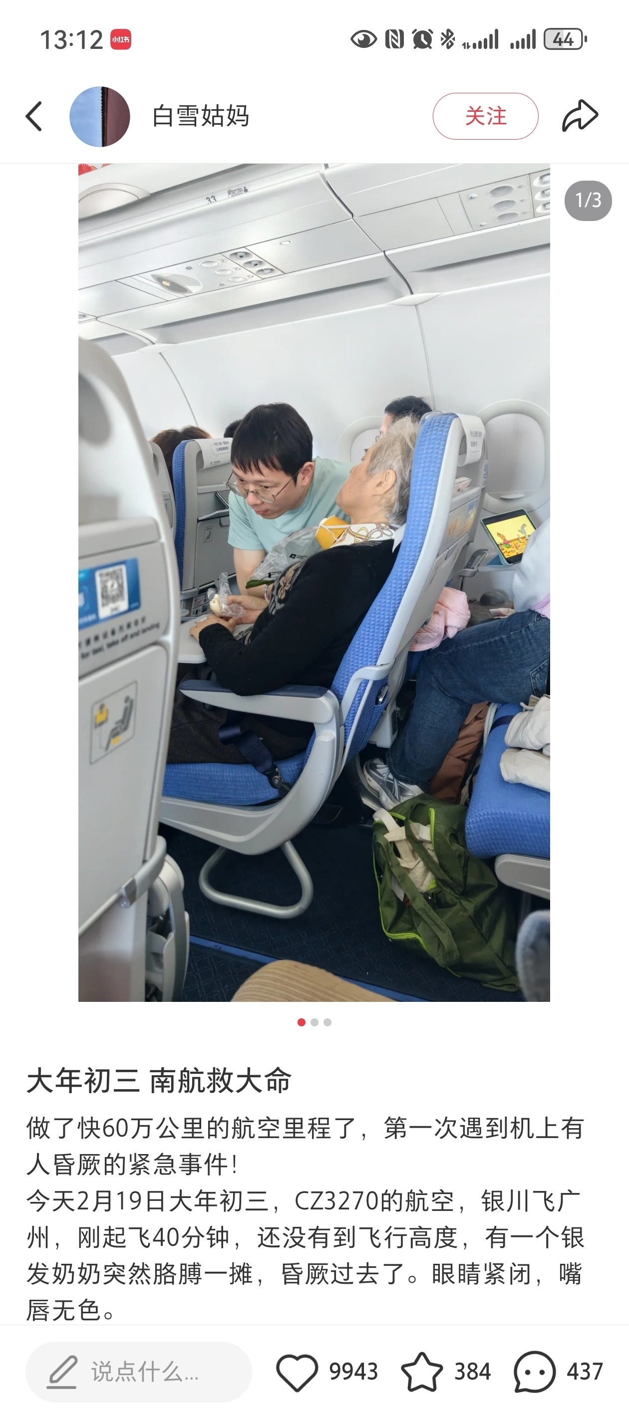 “大年初三救大命!” 一则小红书网友的发帖近期引发热议,真实还原了一场8000米高空的感人救援:大年初三,从银川飞往广州的南航航班上,一名患有糖尿病的银发奶奶突然晕厥,呼之不应、嘴唇苍白,情况十分危急。