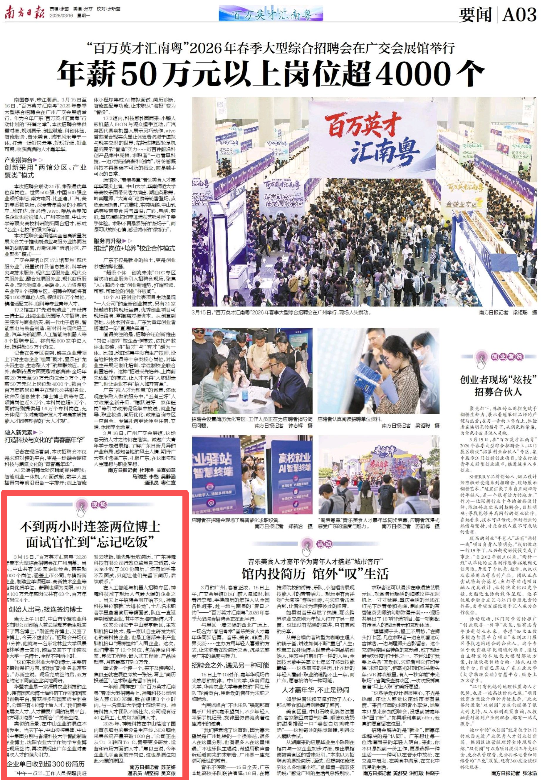 一年前,同样在广东“百万英才汇南粤”春季大型招聘会上,神舞科技公司创始人兼CEO郑辉,就在短短3个小时内,与一名清华大学博士现场签约。神舞科技人才团队不断壮大,公司现有近40名员工,七成均为硕博人才。