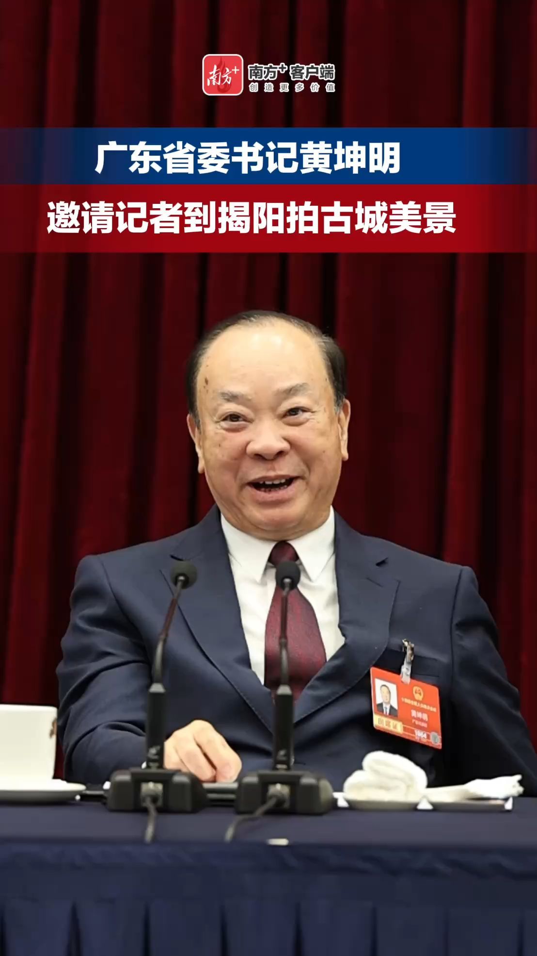 3月6日下午,十四届全国人大四次会议广东省代表团举行开放团组活动,全国人大代表、揭阳市委书记曾风保在审议发言时展示揭阳古城的红灯笼和折扇,现场推介揭阳古城的修缮成效。全国人大代表、广东省委书记黄坤明插话说,揭阳古城非常漂亮,应该邀请记者去拍摄揭阳美景。