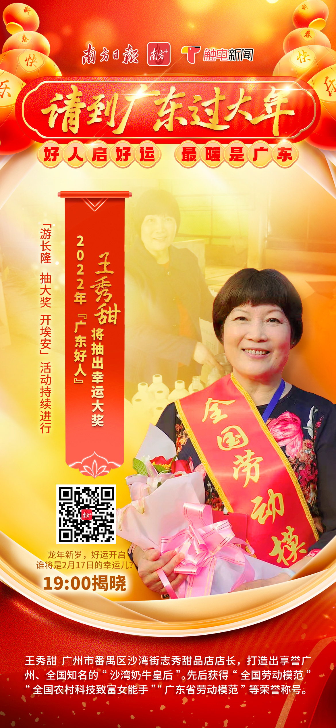 2月17日(初八)开奖活动将于19时举行,2022年“广东好人”王秀甜将开出幸运大奖!点击预约直播,一同见证第九位“锦鲤”诞生!