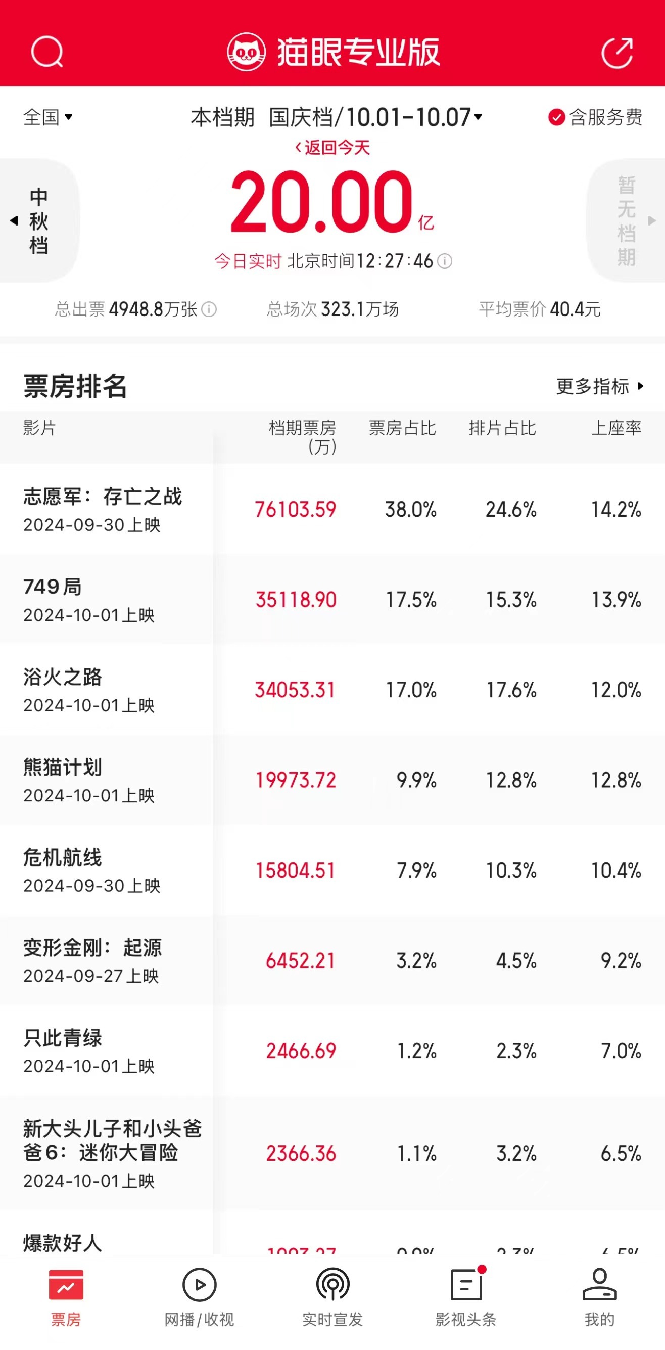 据猫眼专业版数据,截至10月7日12时27分,2024年国庆档档期(10月1日-10月7日)票房突破20亿元,位列中国影史国庆档票房榜第6位。《志愿军:存亡之战》《749局》《浴火之路》暂列国庆档票房榜前三。南方+记者 张思毅 南方日报、南方+客户端原创,未经授权不得转载 编辑 童慧 王瑾校对 叶剑华 订阅后可查看全文(剩余80%)