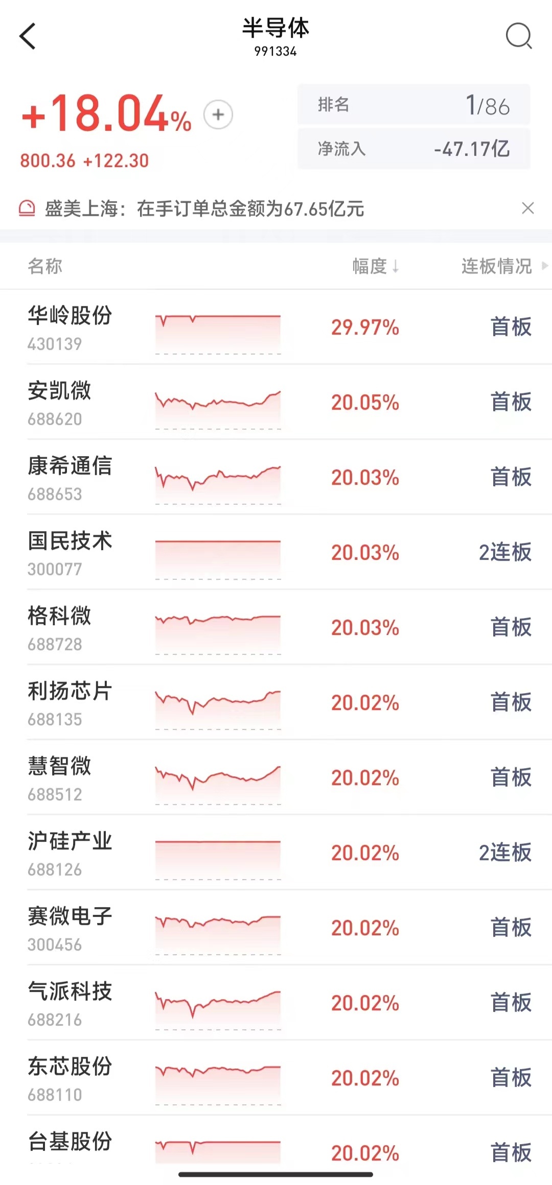 半导体、软件开发、电子化学品、电池、互联网服务等板块大涨。其中,领涨的半导体板块集体掀起“20cm”的涨停潮。