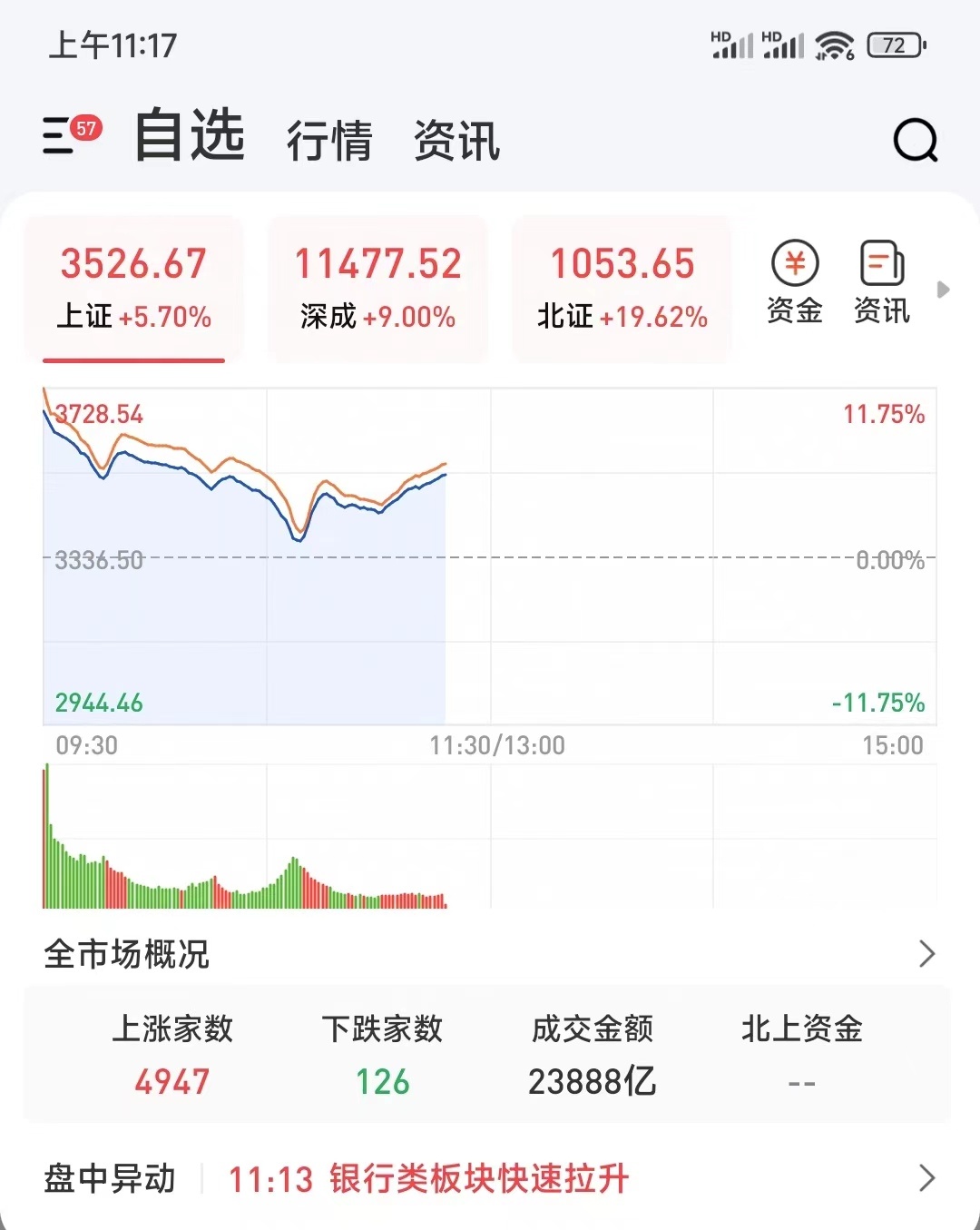 大盘V型反转。截至11点17分,一度收窄到1.14%的沪指拉升至5.7%,重回3500点。银行类等多个板块快速拉升。
