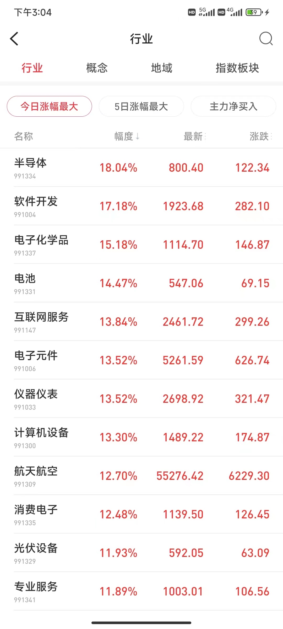 所有板块全线爆发,截至午间收盘无一下跌。半导体、软件开发、电子化学品、电池、互联网服务、计算机设备等板块的涨幅超10%。