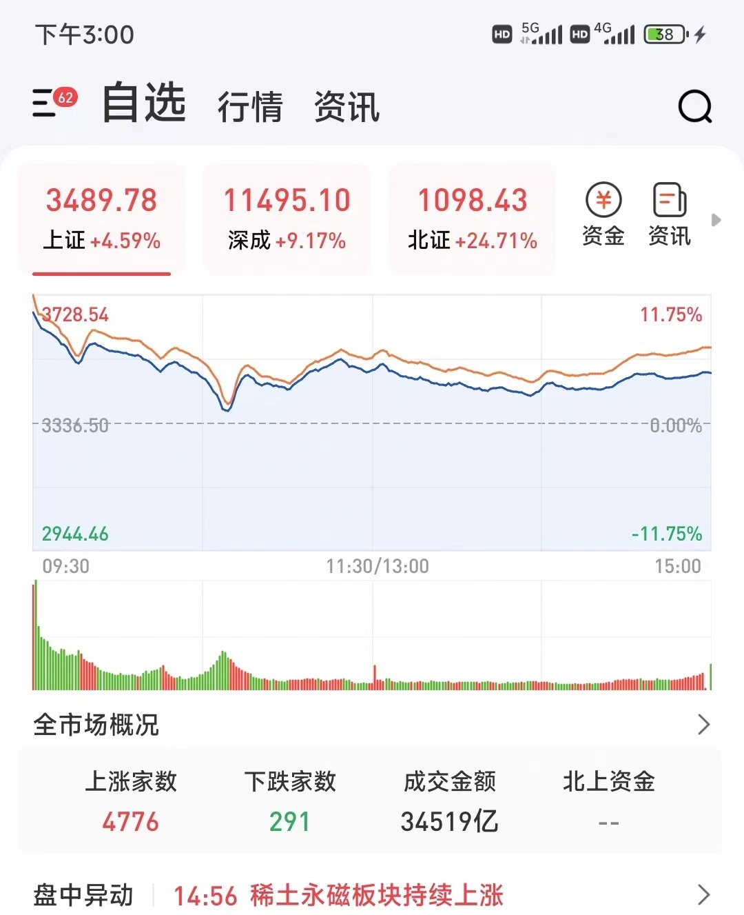 10月8日,国庆假期后的首个交易日,A股开盘三大股指高开超10%。截至收盘,沪指报3489.78点,涨幅4.59%;深成指报11495.1点,涨幅9.17%;创业板指报2550.28点,涨幅17.25%。
