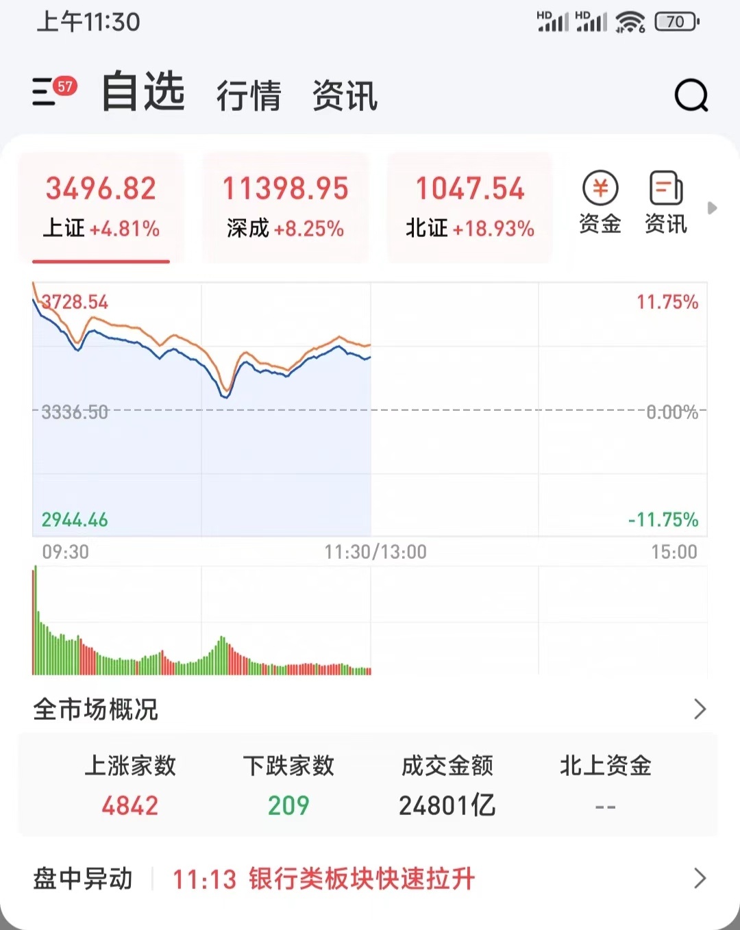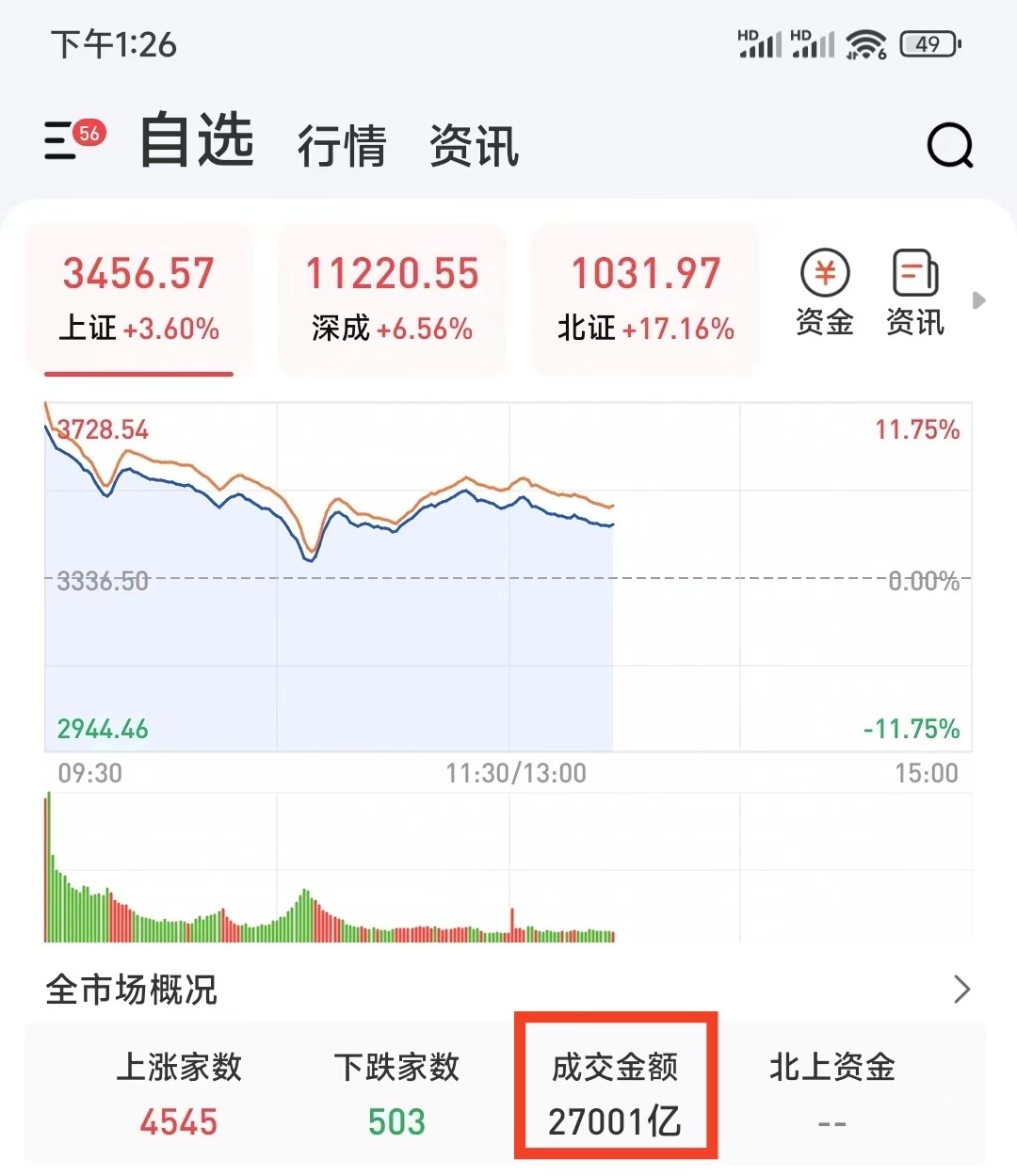 午评:“深V”!三大股指涨超4.81%,成交额刷新历史纪录
