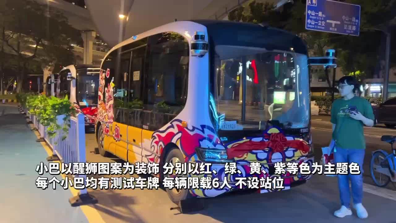现场停放着5台测试小巴,小巴以醒狮图案为装饰,分别以红、绿、黄、紫等色为主题色。
