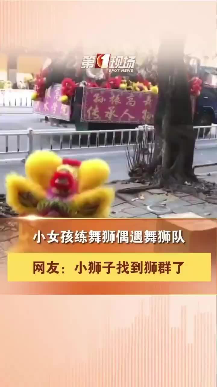 小狮子找到狮群了!女孩路边练舞狮偶遇舞狮队敲锣助威