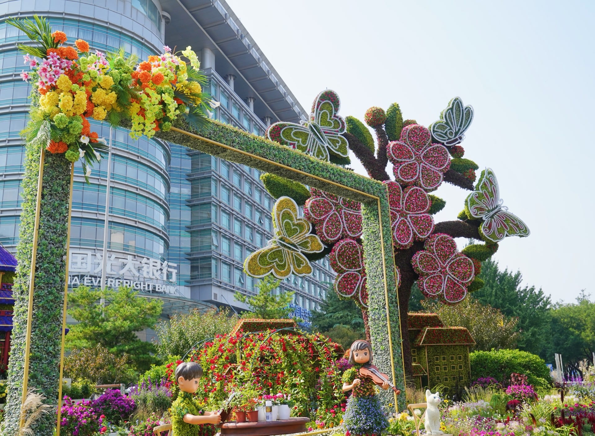 今年,长安街沿线建国门到复兴门之间精心布置10组立体花坛,描绘了祖国繁荣昌盛、人民安居乐业的中国式现代化新篇章。其中,东长安街5组花坛体现普天同庆,共贺祖国取得的伟大成就;西长安街5组花坛体现了华夏儿女共建共享美好家园的幸福生活。