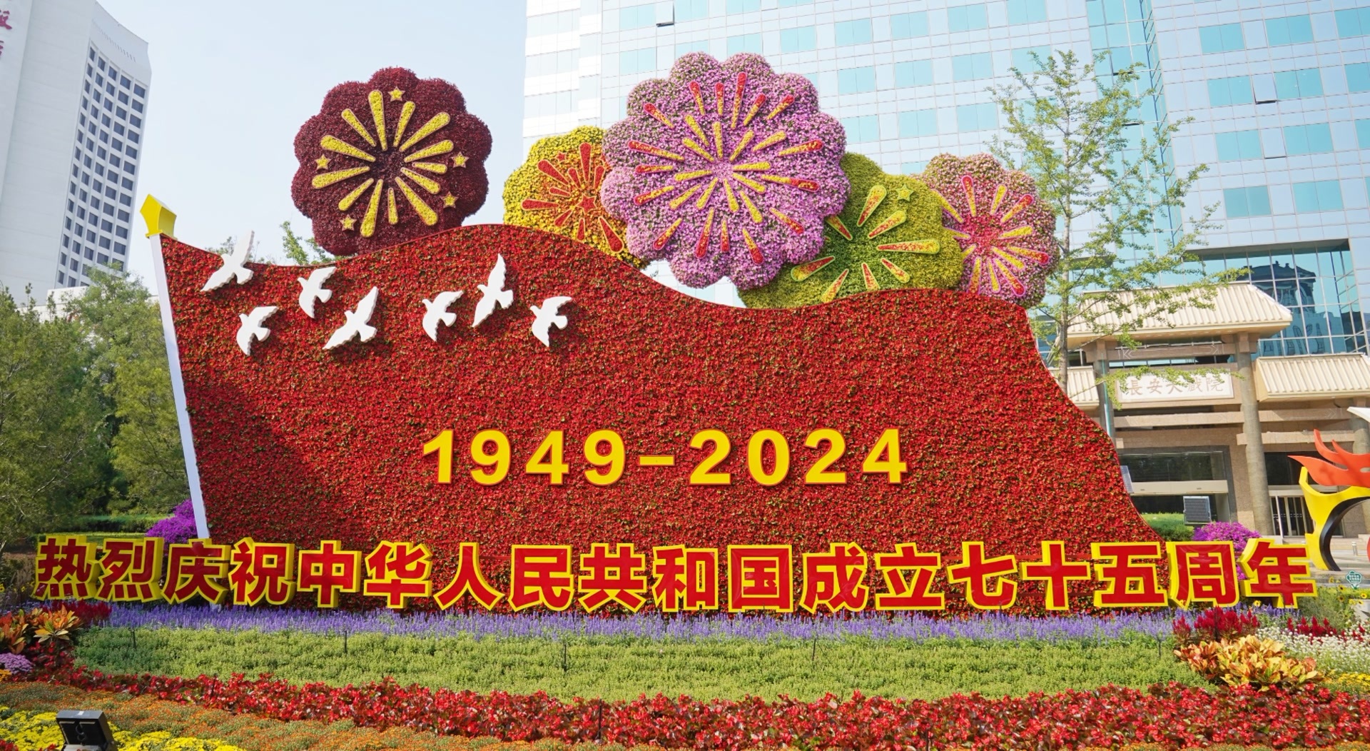 建国门西北角,“普天同庆”花坛以嵌有“1949-2024”的红旗为主景,配以烟花、白鸽、庆祝标语等,热烈庆祝中华人民共和国成立75周年。花坛顶高8米。