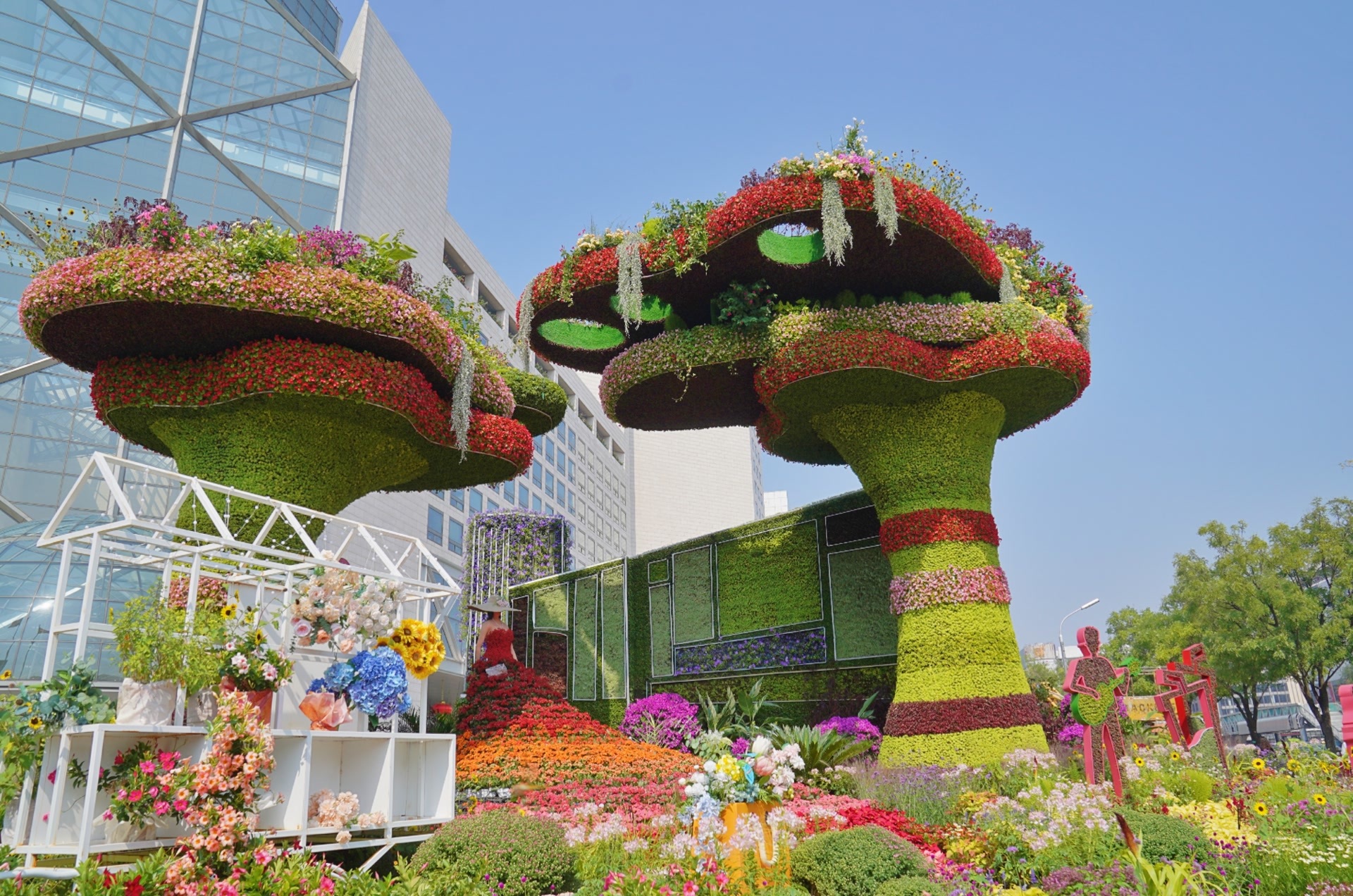 西单西北角,“花园商圈”花坛以欣欣向荣的首都花园商圈为场景,配以模特、展陈、售卖等元素,体现绿意盎然、时尚愉悦的绿色商业环境,提升百姓的获得感和幸福感。花坛顶高8米。