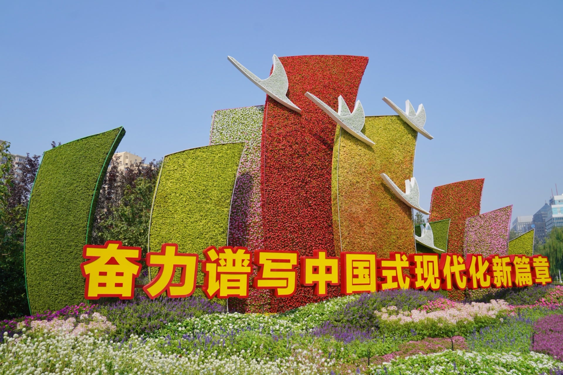 为营造隆重热烈、喜庆祥和的氛围,天安门广场、长安街沿线及全市重点站区以“筑梦现代化,共绘新图景”为主题进行花卉布置。