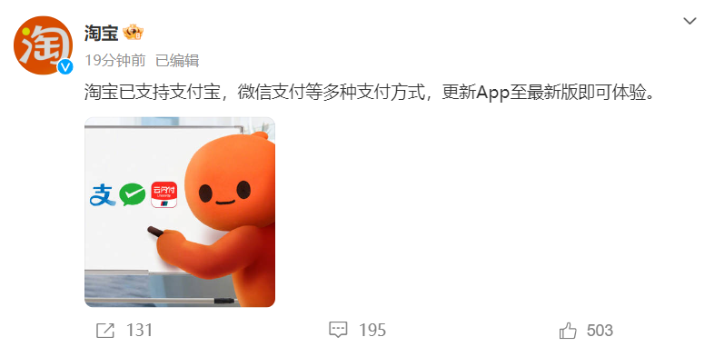 早在9月5日,淘宝平台曾发布关于淘宝网新增微信支付能力的公告,为提升消费者的购物体验,淘宝网计划新增微信支付能力,并于9月12日后逐步向所有淘宝网卖家开放。