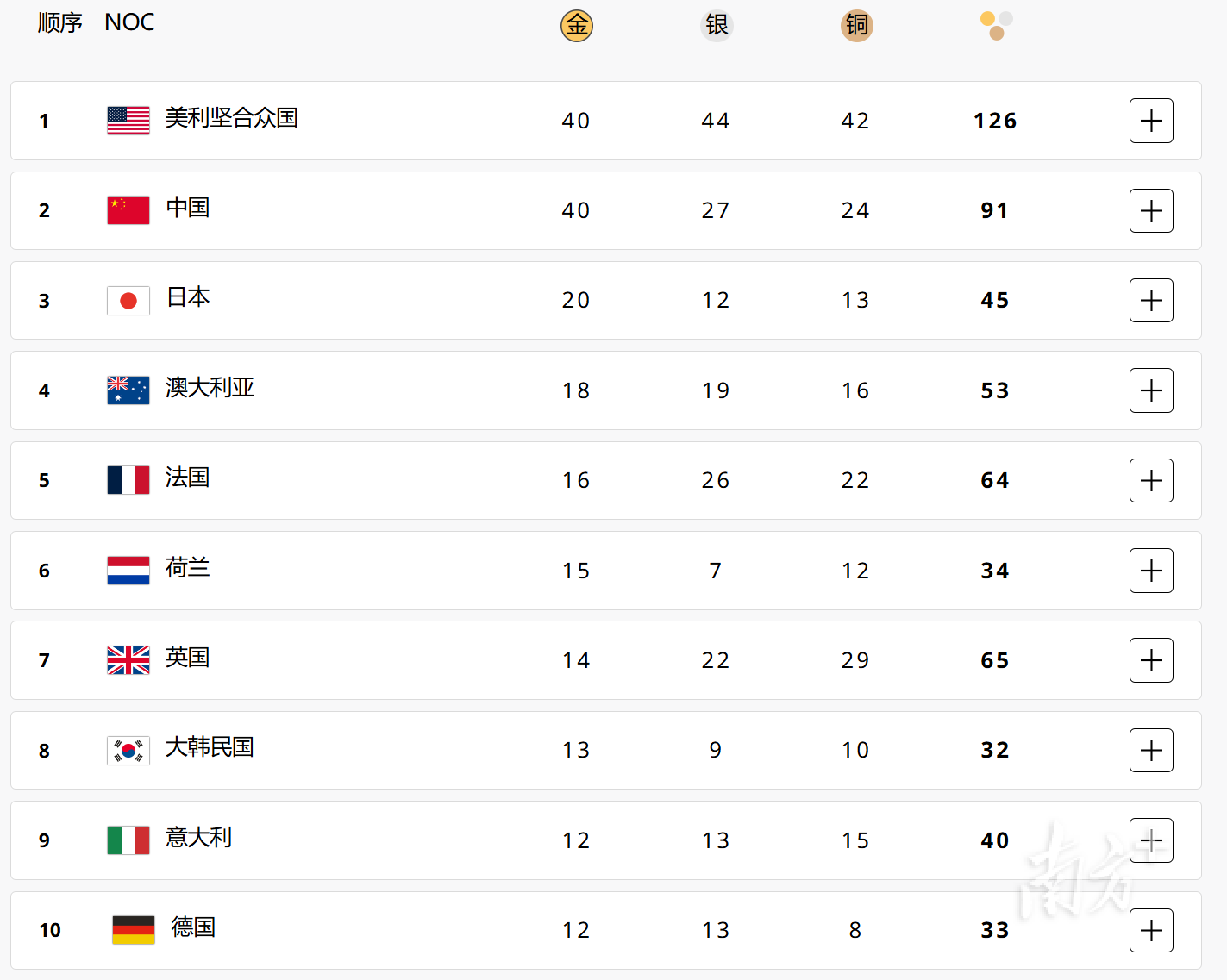 除了中国队与美国队之外,排在巴黎奥运会金牌榜前十名的队伍分别是日本队(20金)、澳大利亚队(18金)、法国队(16金)、荷兰队(15金)、英国队(14金)、韩国队(13金)、意大利队(12金)和德国队(12金)。