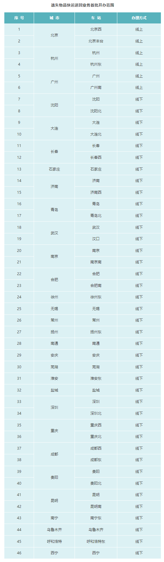 1月25日起,铁路部门在北京西站、北京丰台站、杭州站、杭州东站、广州站、广州南站等3座城市6个车站试点开展遗失物品线上预约快运送回服务,进一步提升便民服务水平。