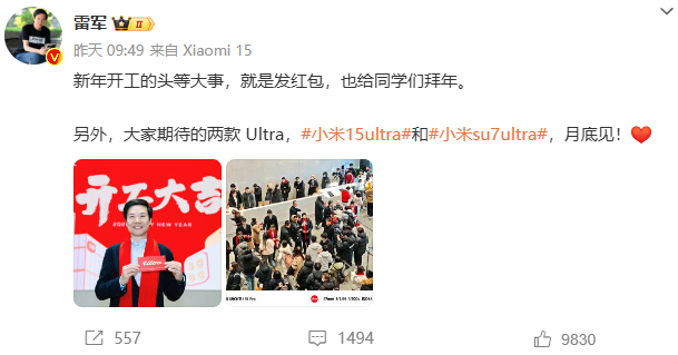 而小米创办人、董事长兼CEO雷军日前预告,小米15 Ultra和小米SU7 Ultra将在本月底发布。小米这三款产品或将同台亮相。