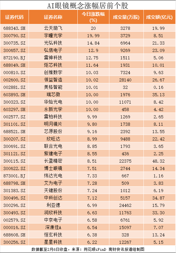 值得注意的是,2月6日,端侧AI概念集体爆发,AI眼镜板块涨幅居前,云天励飞(688343.SH)、瑞芯微(603893.SH)等多股涨停。