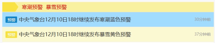 在10日的18时,中央气象台继续发布寒潮蓝色预警和暴雪黄色预警。