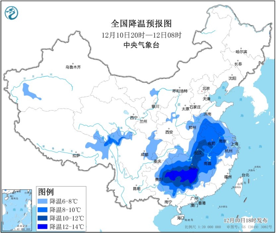 预计,受强冷空气影响,12月11日至12月12日8时,西藏东北部、川西高原北部、黄淮南部、江淮、江汉东部、江南中西部、贵州东部、华南北部等地大部将先后降温6℃-8℃。山西南部、河南北部、辽宁东南部等地的部分地区有暴雪。