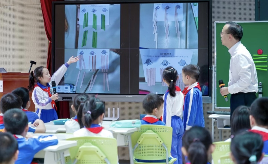课堂尾声,一名学生突然提出“如果要分的数量很大,用小棒摆太麻烦了怎么办”的深度提问,张校长顺势引出“用算式替代操作”的思路,既回应了学生的真实困惑,又为后续除法运算的学习埋下关键伏笔,展现了“以学定教”的教学智慧。