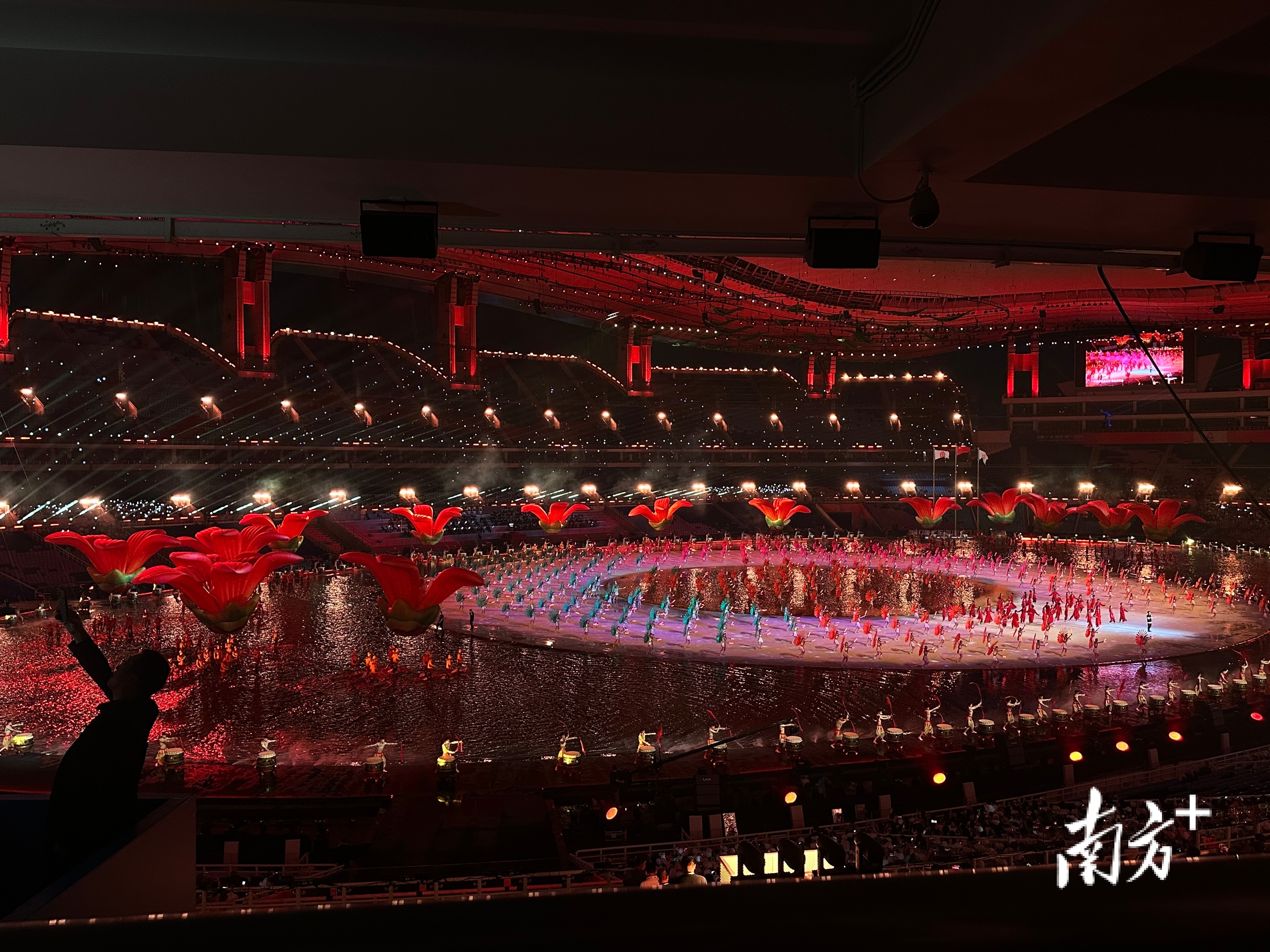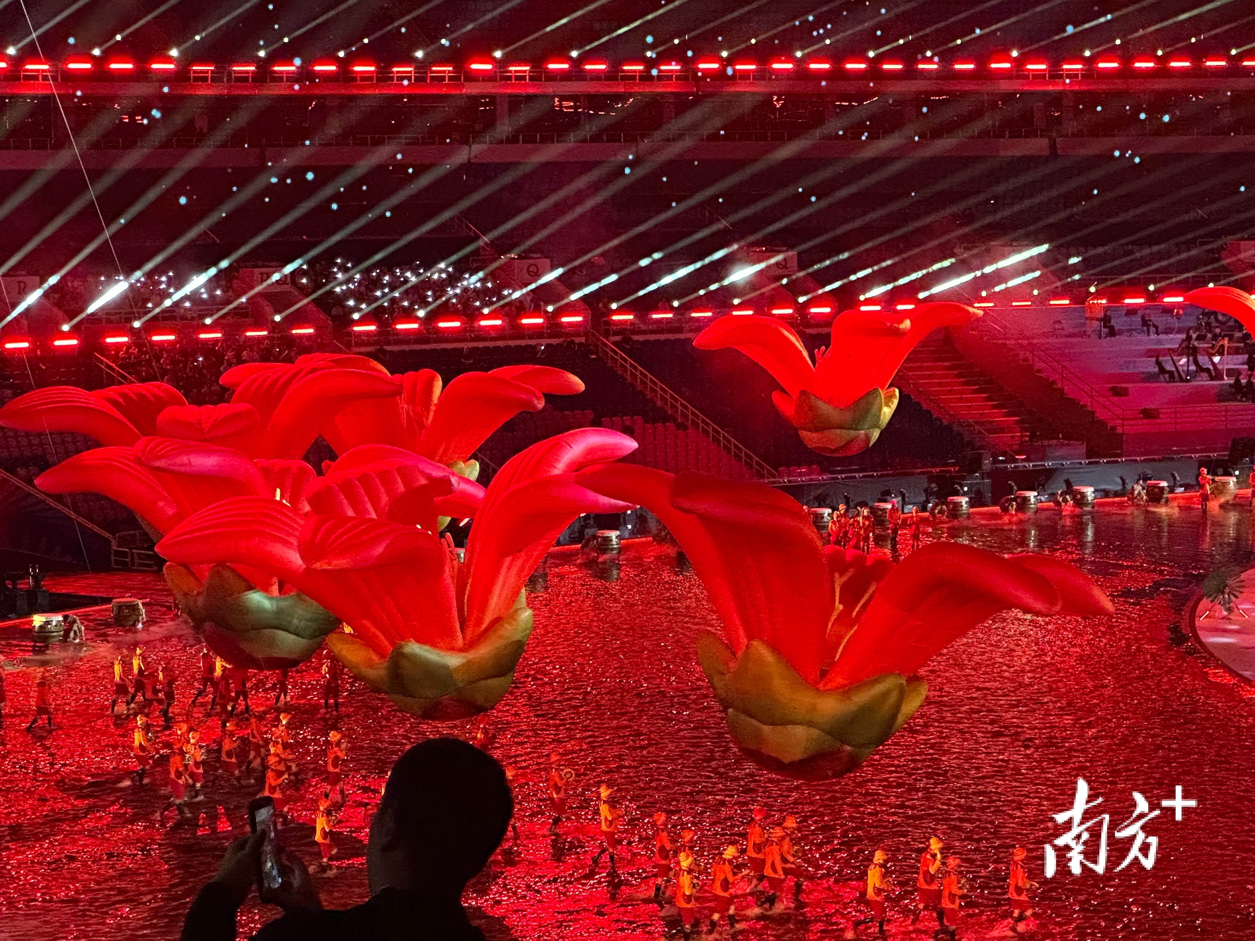 据透露,开幕式彩排期间广东常下雨,导演团队因地制宜,结合简约办赛的理念,将雨水留下变成舞台道具,最终在体育场内“造出一片海”。