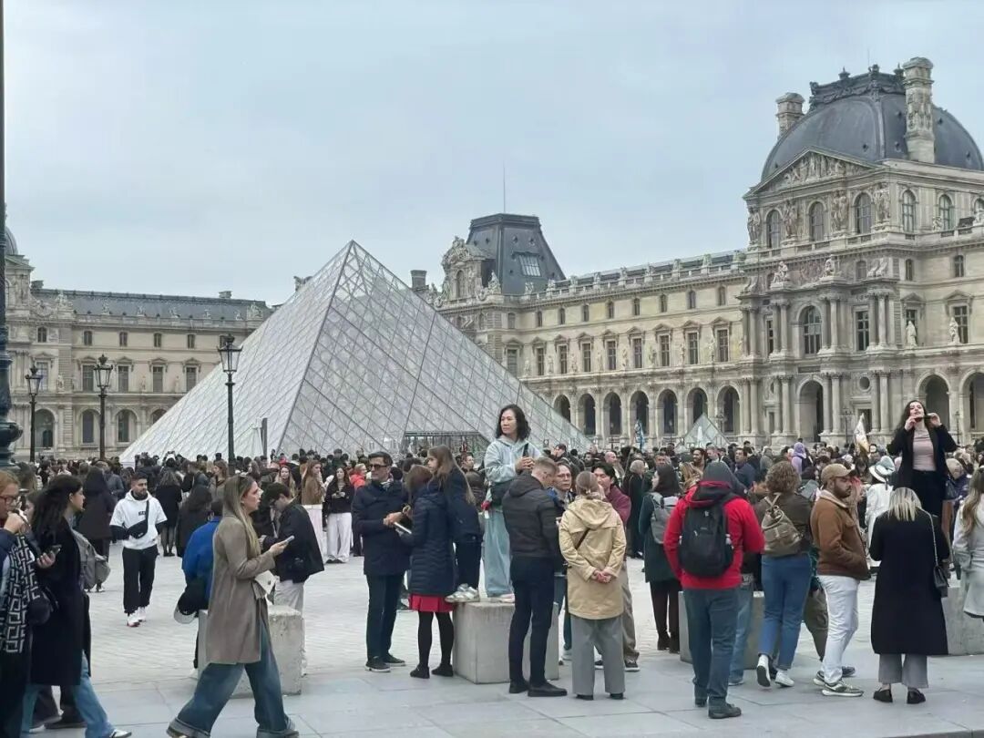 ▲当地时间2025年10月19日,法国巴黎,劫案发生后,游客聚集在卢浮宫外的广场上。(受访者供图)