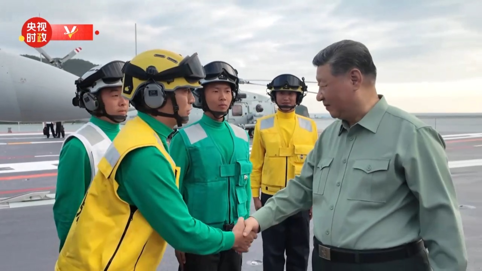 宽阔的飞行甲板上,4道阻拦索、3个弹射起飞位格外醒目,歼-35、歼-15T、空警-600等新型舰载机依次停放。习近平听取甲板功能布局介绍,不时驻足察看装备设施。习近平同舰载机飞行员亲切交流,详细询问飞机技战术性能和电磁弹射特点优势,观看舰载机弹射放飞流程演示。身着多种颜色马甲的航空保障人员看到习主席到来,纷纷围拢过来,向习主席问好,报告各自岗位和主要职责。习近平勉励大家不断提升专业技能和打仗本领,为福建舰战斗力建设贡献力量。