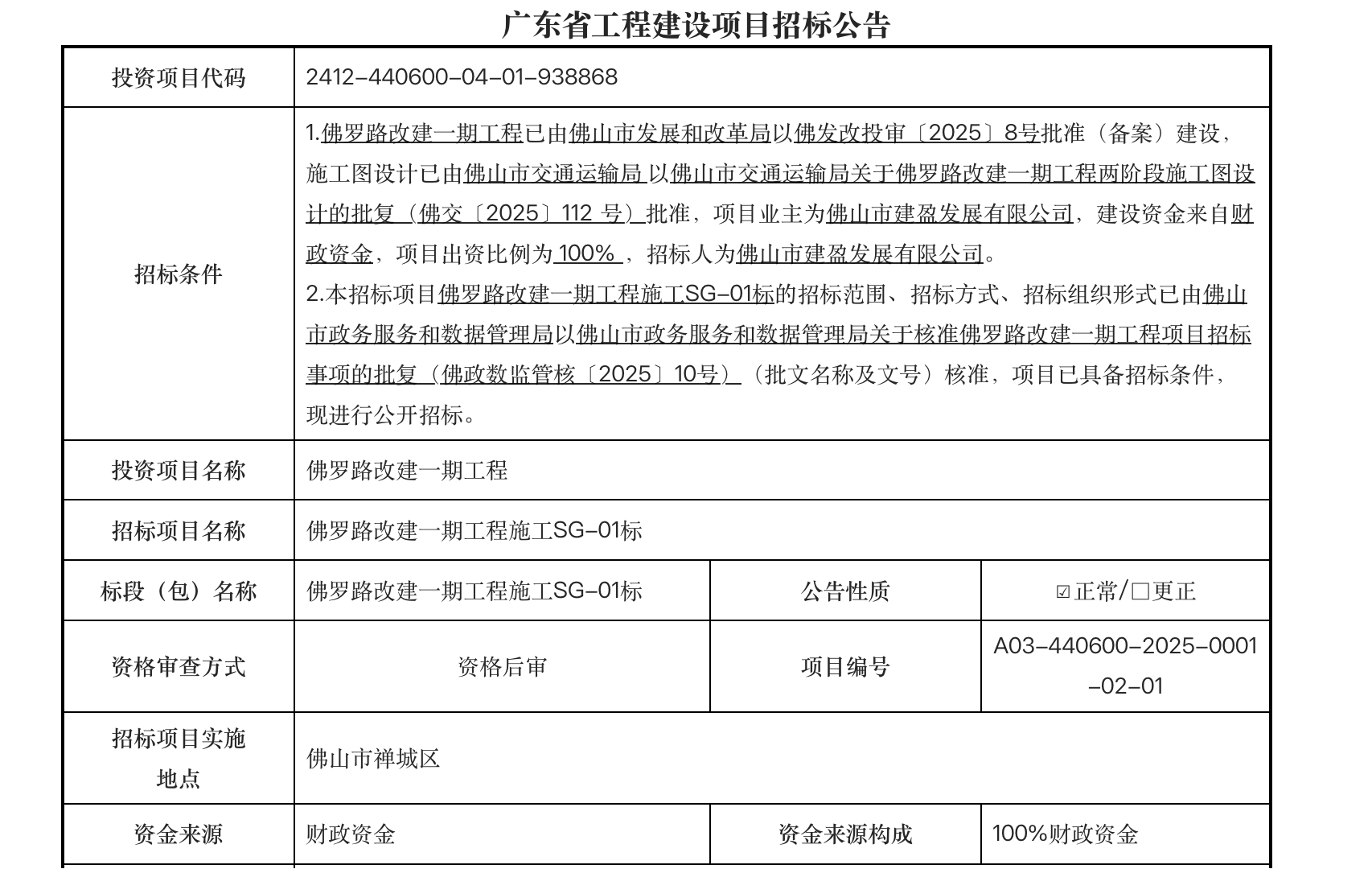 “佛罗路改建一期工程施工SG-01标”的招标公告。图源:广东省公共资源交易平台