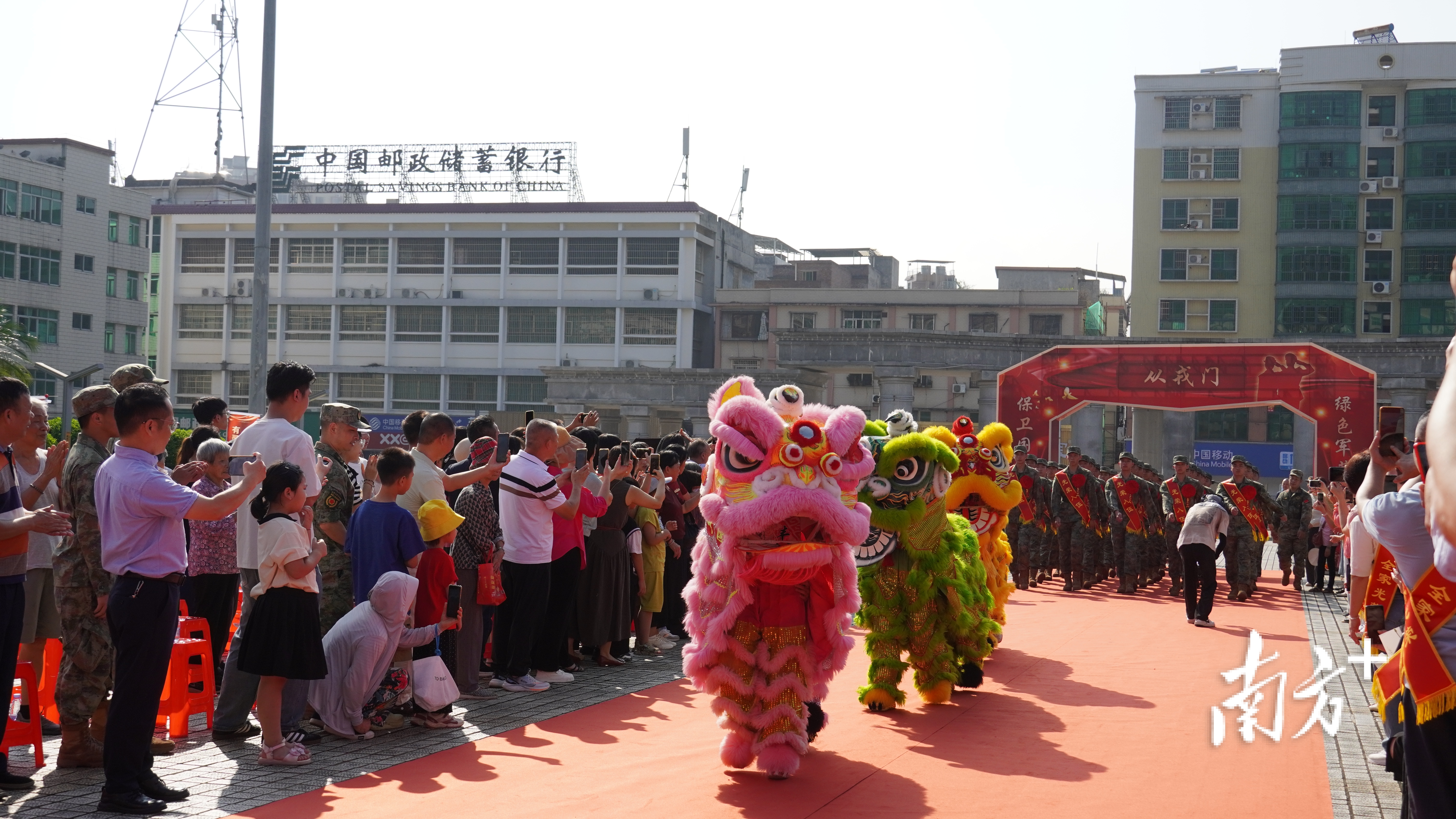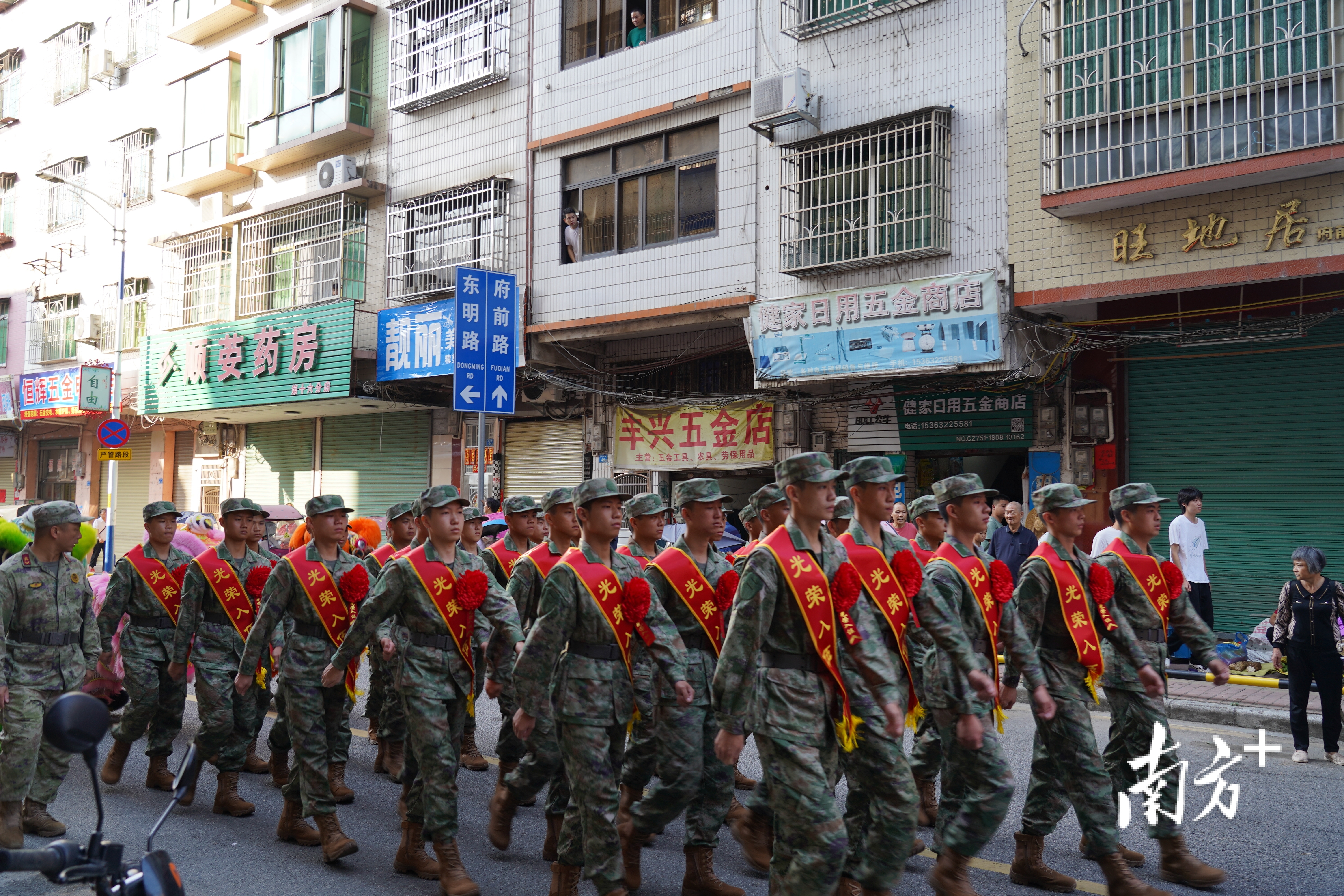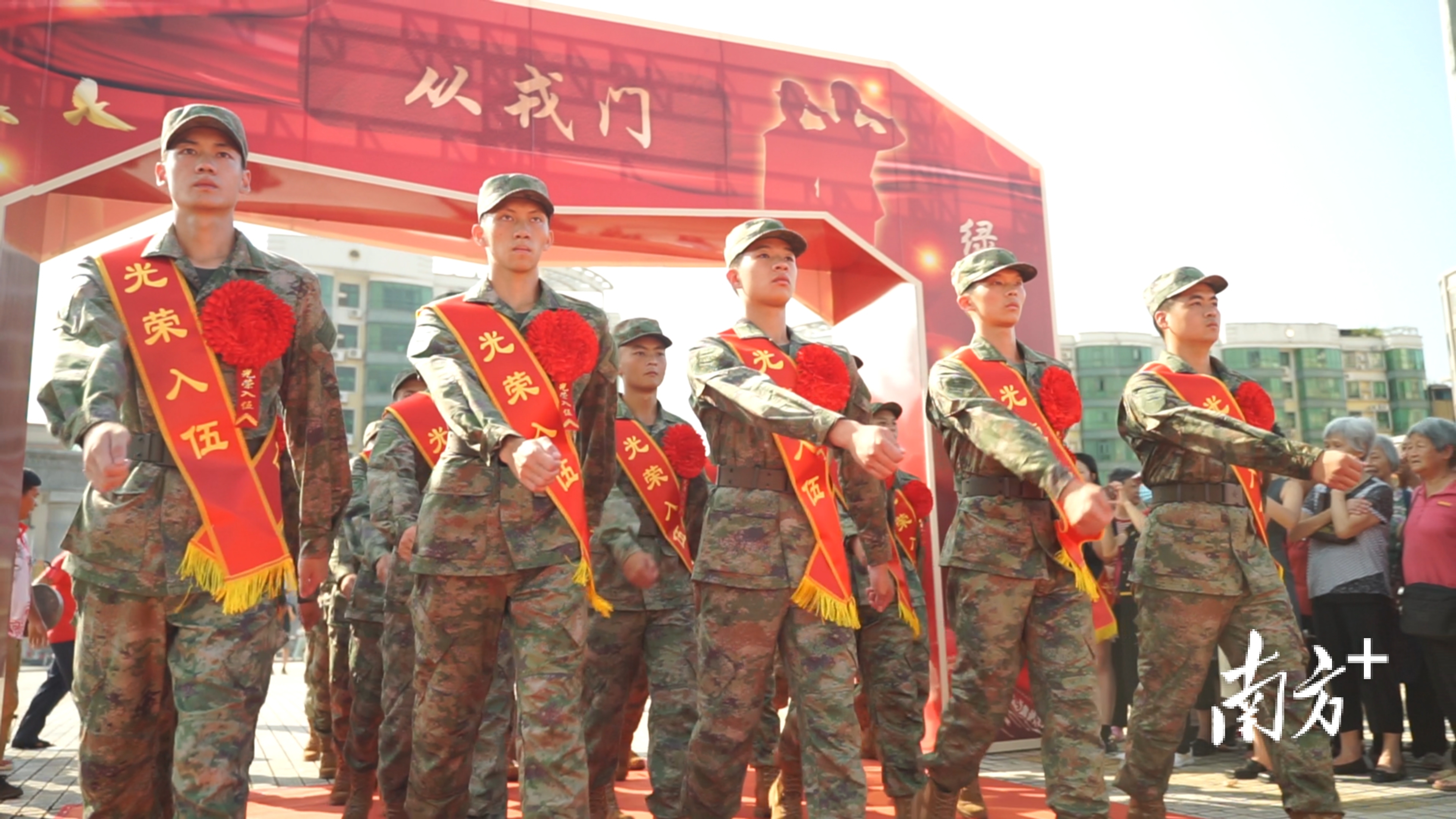 上午8时,随着一阵激昂的锣鼓声响起,舞狮队伍开始引领入伍新兵方阵巡游新丰主要街道。街道两旁,早已站满了群众,他们纷纷拿起手机驻足拍照。新兵步履坚定、整齐有序地走过“从戎门”,以昂扬姿态诠释了青春献军营,忠心报祖国的责任担当。