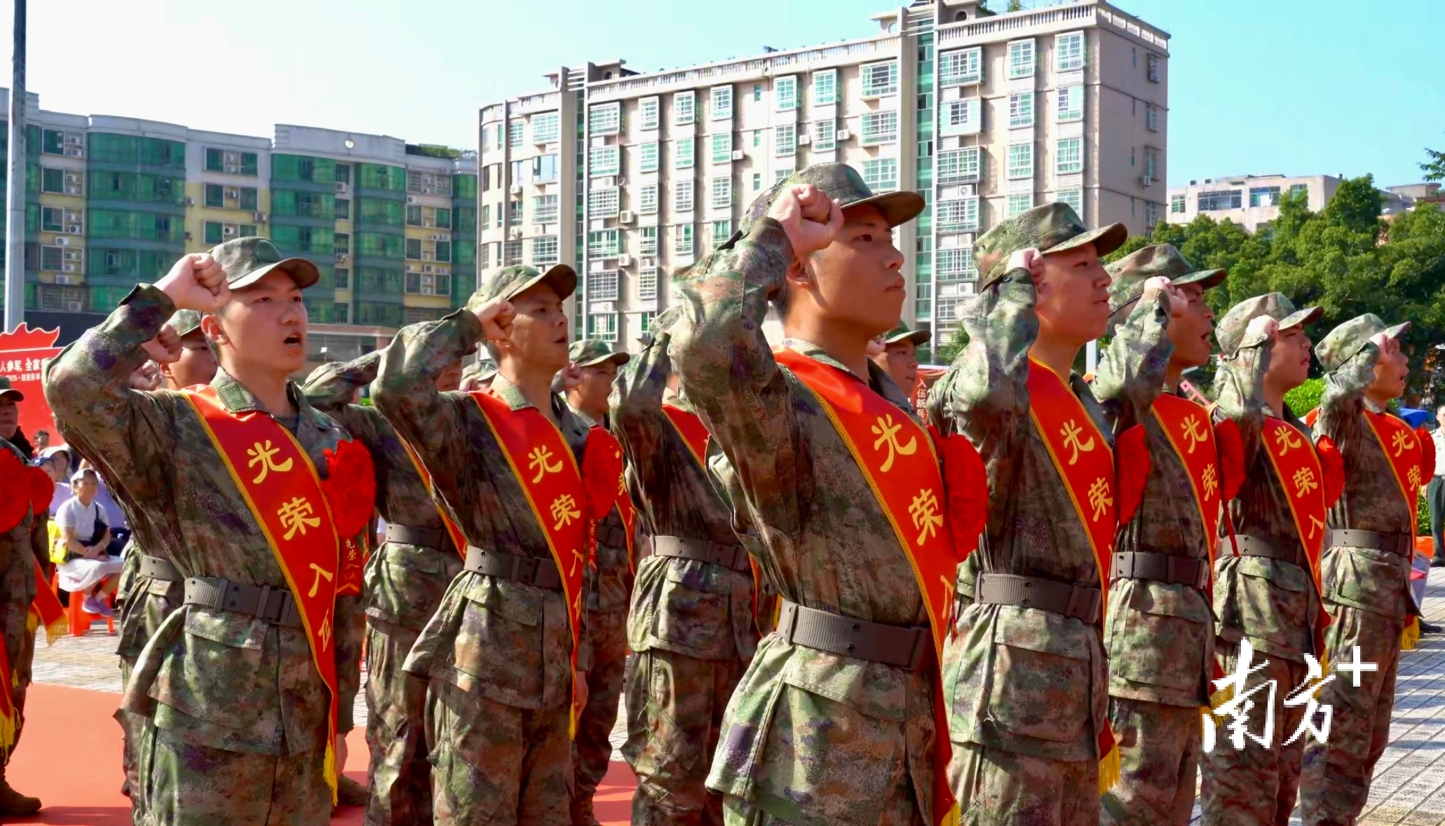 仪式在庄严的国歌声中拉开帷幕。带训教官走到新兵队列前,高举右拳带领宣誓。“服从中国共产党的领导,全心全意为人民服务,服从命令,严守纪律……”铮铮誓言响彻会场,尽显参军决心。
