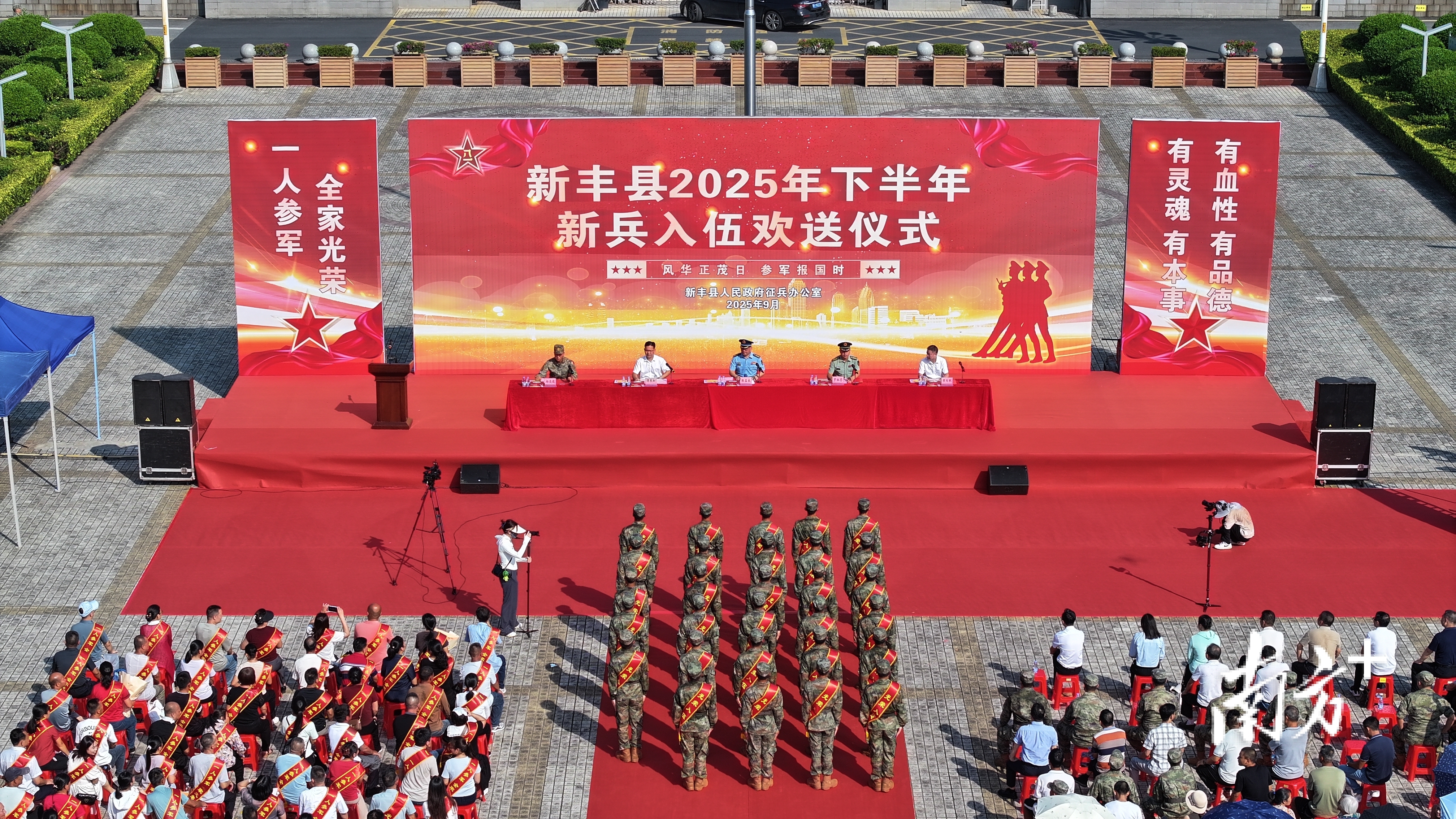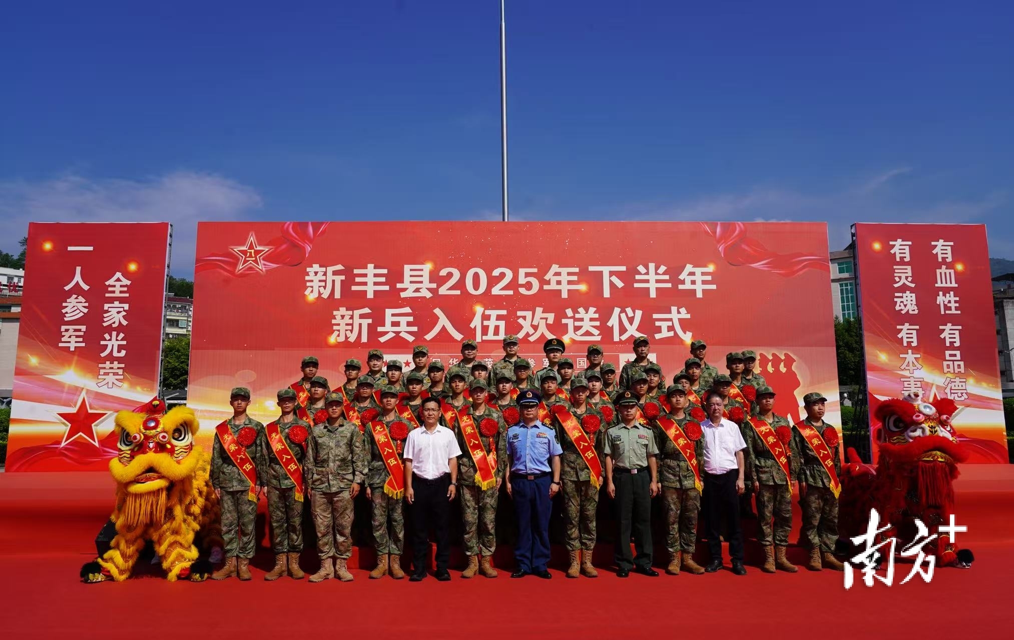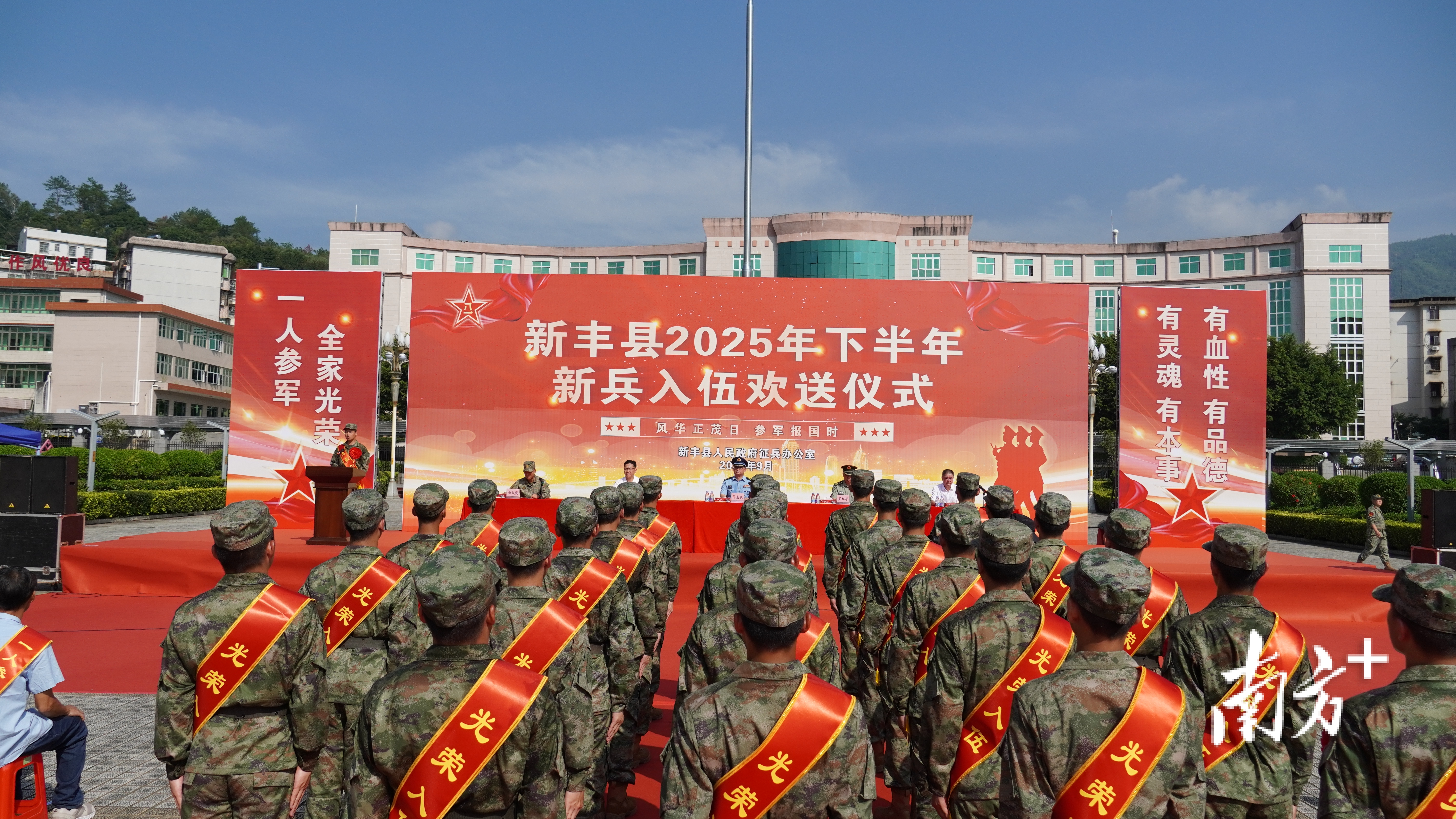 金秋九月送新兵,热血青春铸军魂。9月14日上午, 新丰县举行2025年下半年新兵入伍欢送仪式。来自新丰县各镇(街)的预定新兵胸戴红花、身披绶带,带着家乡人民的殷切期望,即将踏上保家卫国的光荣征程。县委常委、县征兵办主任、人武部部长陈益良出席活动,县征兵工作领导小组副组长、人武部政治委员罗红誉主持活动,副县长、马头镇党委书记谭展如,县退役军人事务局主要负责人,部队接兵干部等参加活动。