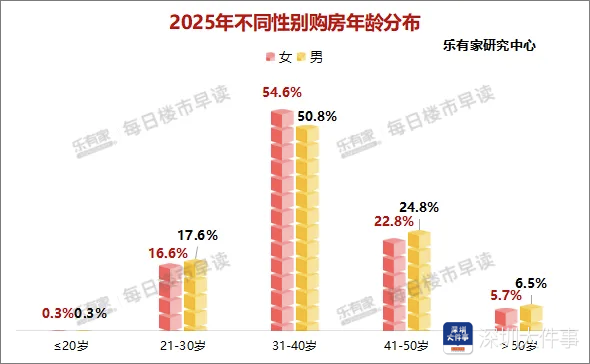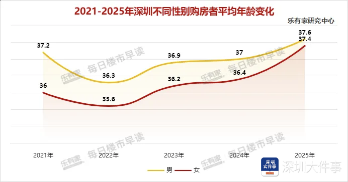 乐有家研究中心数据显示,深圳女性比男性更早买房。近5年深圳女性的平均购房年龄一直早于男性,2025年女性平均购房年龄为37.4岁,男性为37.6岁。虽然差距在缩小,但女性“先上车”的趋势依然延续。