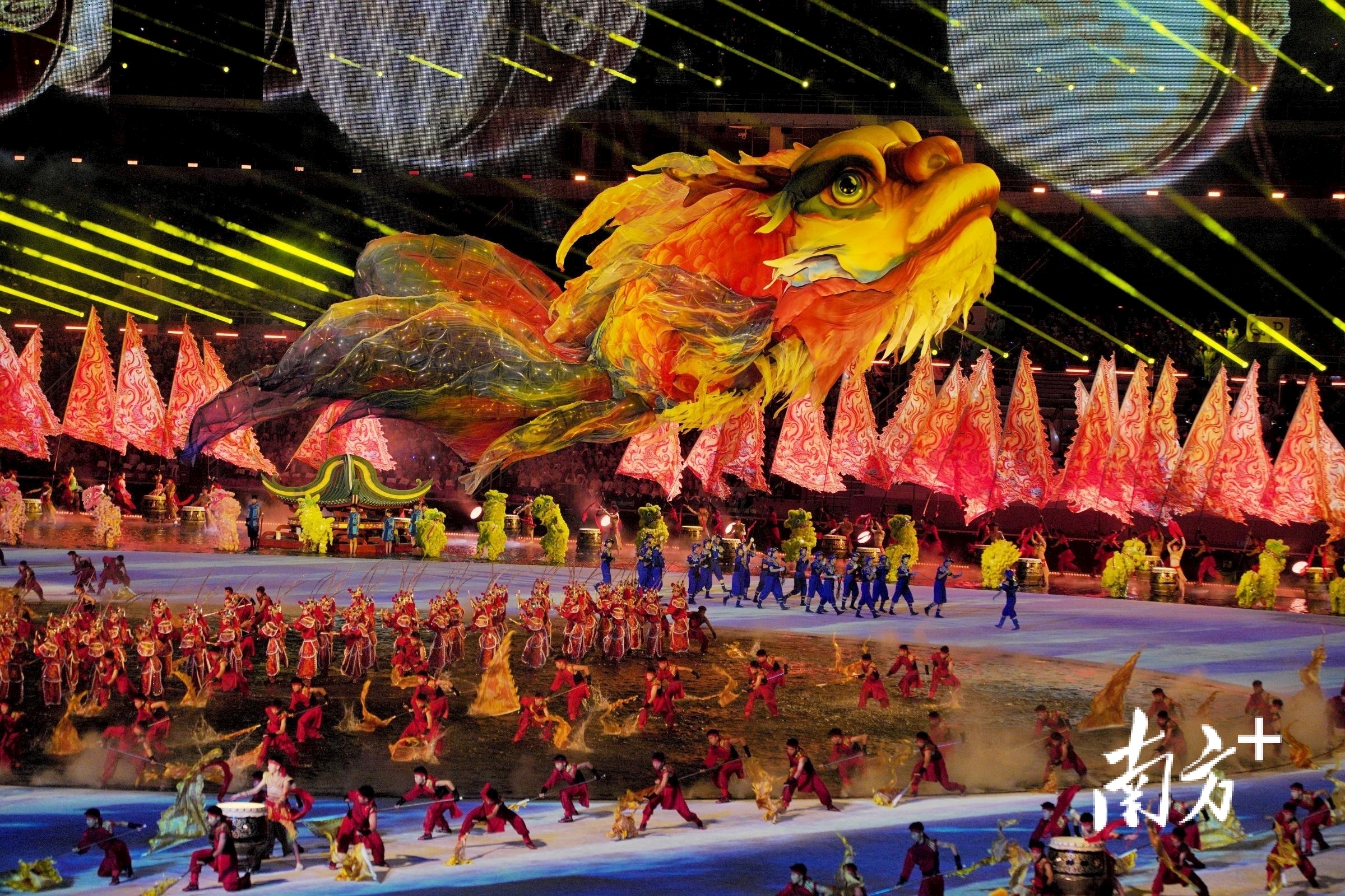 开幕式上,那条“破水而出”的空飘鳌鱼,作为大型体育赛事开幕式中首次应用的岭南文化形象,绕场飞行时引得观众阵阵惊呼,让传说中的“大鱼海棠”有了震撼的具象呈现。