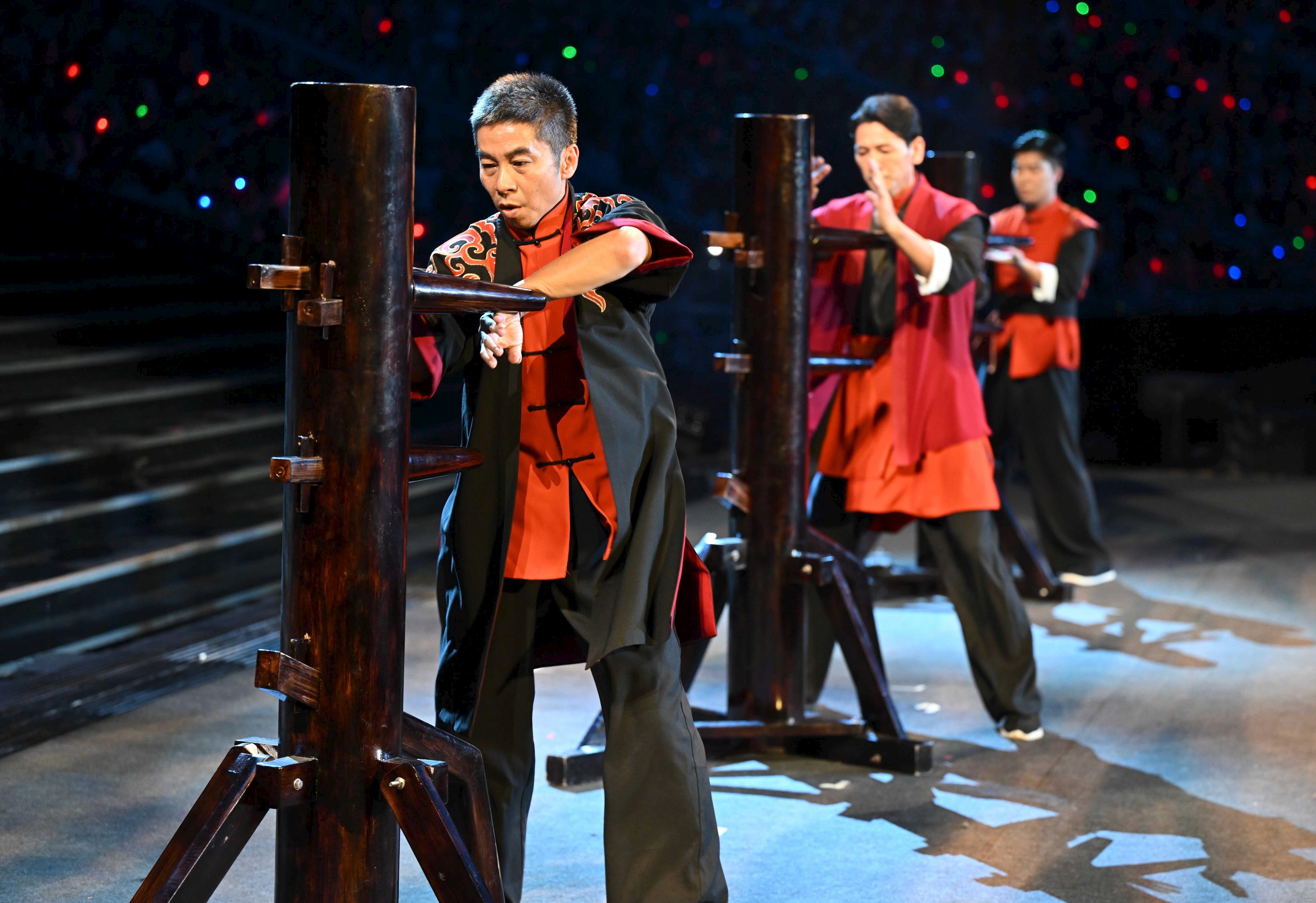 《沧海一声笑》的经典旋律响起,咏春与南拳方阵刚柔并济,瞬间唤醒了深植于观众心中的武侠情怀。