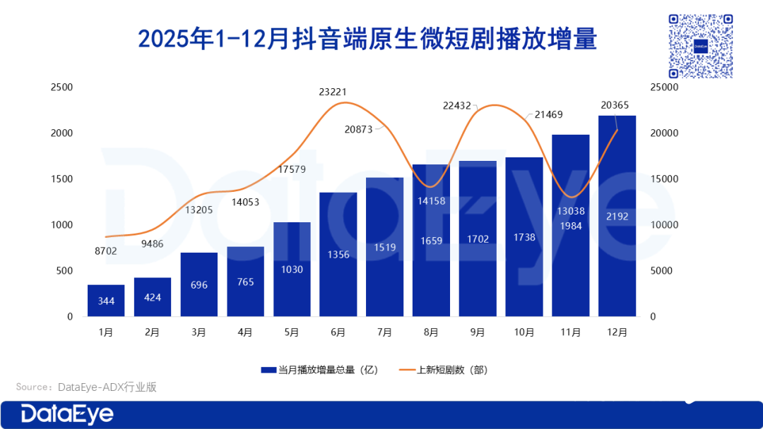抖音端原生累计播放量破亿的微短剧中,短剧数从1月的1175部持续增长至12月的5427部,整体呈稳步上升态势,说明抖音端能达到“亿级播放量”的微短剧规模在不断扩大。6月起,新剧当月破亿的数量保持在百部以上,反映出2025年中期开始,抖音微短剧 “破亿效率” 显著提升,播放渗透率在扩大,越来越多作品能触达“亿级流量”门槛。