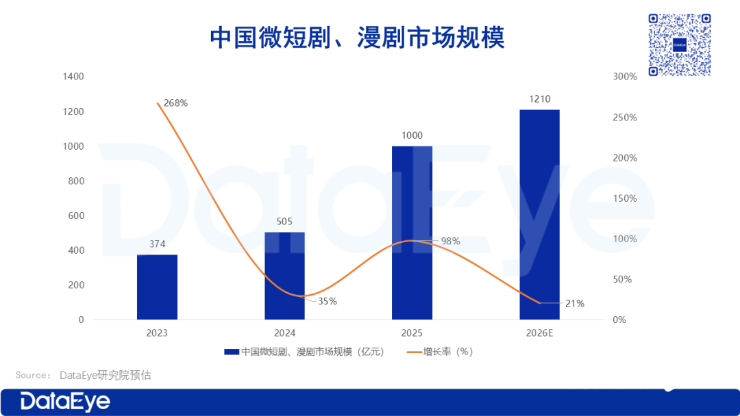 近日,DataEye发布2025年微短剧行业数据报告。报告显示,2025年中国微短剧、漫剧全年产值达千亿,这一数值大幅超出此前600亿元左右的市场预期。同期全国电影总票房为518.32亿元,微短剧、漫剧市场体量已接近电影票房的两倍。这一轮爆发式增长,主要得益于免费微短剧市场的持续扩容,以及漫剧赛道的异军突起。2025年,免费真人微短剧市场规模超500亿,约占真人微短剧整体市场的比重约达三分之二;漫剧市场规模估计接近200亿元。DataEye研究院预估:2026年中国微短剧、漫剧市场规模保守估计将突破1200亿。