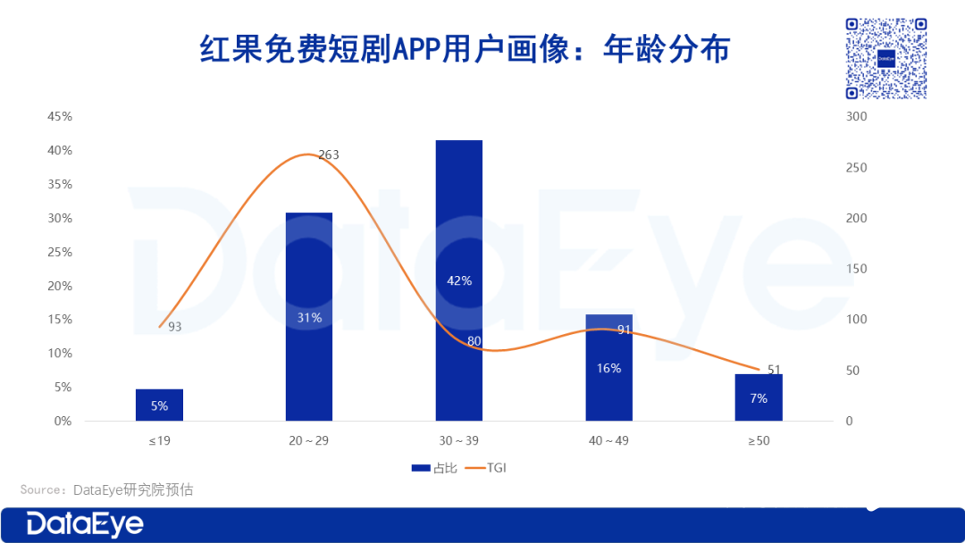 从年龄分布来看,红果短剧用户群体更为年轻化。具体数据显示,40岁以下用户合计占比超七成,成为平台的核心受众群体。其中,30岁以下用户占比达36%,远超全市场该年龄段1/4的平均水平。而50岁以上用户占比仅为7%,占比相对较低。2025年,红果短剧持续深耕年轻化内容赛道,上线奇幻脑洞、系统流等深受年轻群体喜爱的题材。从用户偏好度(TGI)的维度来看:20-29岁用户黏性位居首位,TGI数值高达263;19岁及以下用户紧随其后,TGI为93;40-49岁中年用户位列第三,TGI达91。