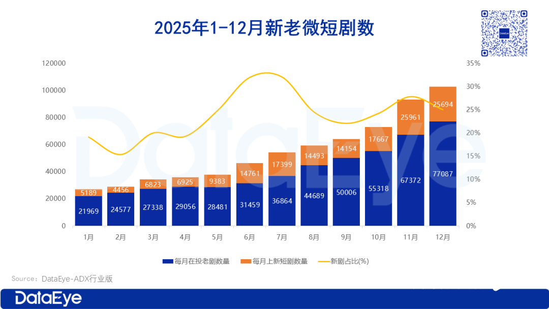 ADX行业版数据显示,2025年,参与投流的微短剧总数超19.2万部,其中新剧总数超16.2万部,占比约84%。2025年,国内参投微短剧数量呈大幅激增态势。从分月数据来看,每月参投微短剧数量稳步提升,其中老剧的长尾效应显著,新剧供应则持续攀升。其中,6月新剧数量超1万部,11月突破2万部,每月新剧占比在25%左右。