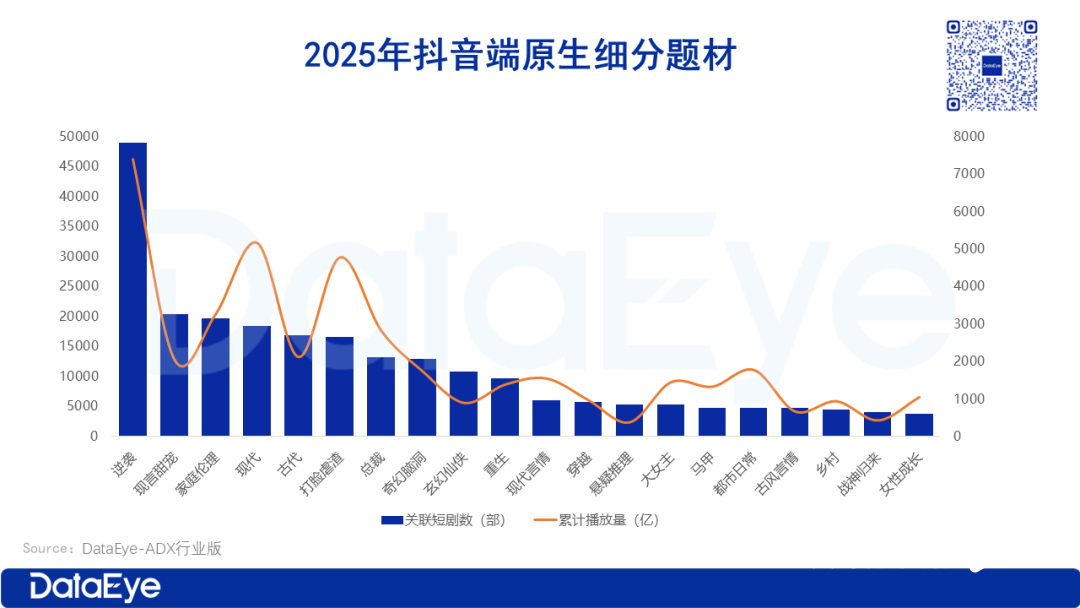 抖音端原生微短剧题材共68种,其中,逆袭、现言甜宠、家庭伦理关联短剧数为TOP3,逆袭、现代和打脸虐渣累计播放量位居TOP3。从供给和需求方面来看,逆袭题材断层领先,关联短剧数达48917部,累计播放量达7389亿。现言甜宠、家庭伦理、古装、奇幻脑洞也是较为热门的题材。乡村题材闯入TOP20,关联4412部微短剧,较上半年的1059部翻了3倍。此类题材内容的增多,主要受下沉本土创作者的产能释放影响。