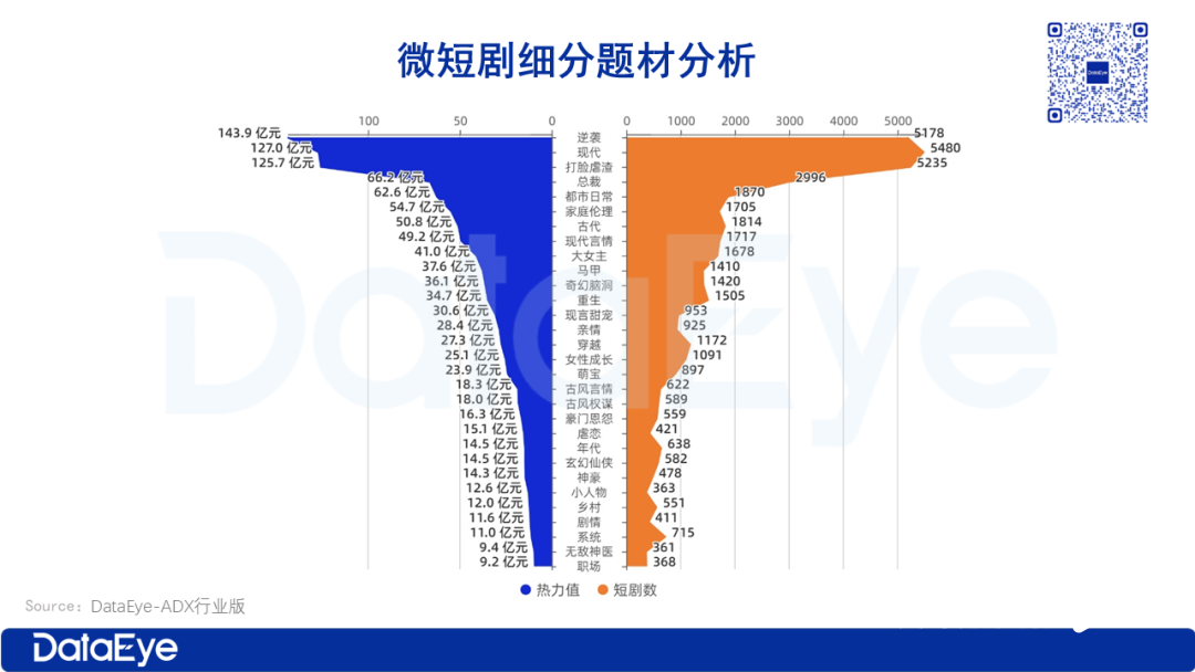 “逆袭”题材热力值达143.9亿,短剧数达5178部,在“热度规模”和“作品数量” 上均为绝对第一,是微短剧最核心的赛道。“现代”与“打脸虐渣”两大题材表现亮眼,二者热力值均突破125亿,短剧数量也超5200 部,共同跻身第一梯队。值得注意的是,这两大题材与“逆袭”题材的市场差距正逐步缩小,赛道竞争日趋激烈。值得关注的是,如“女性成长”“亲情”“穿越”等中腰部题材,短剧数仅在800-1000部,但热力值可达25亿量级,竞争相对缓和,部分制作方可考虑深耕该垂直用户。