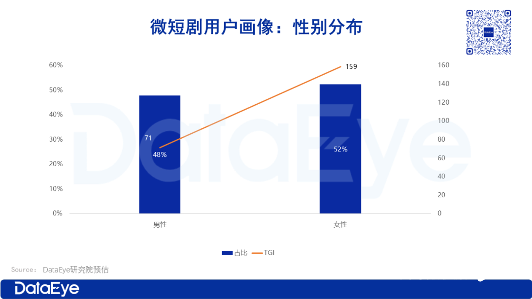 从性别分布来看,2025年微短剧用户性别结构趋于均衡,男性用户占比约48%,女性用户占比约52%,二者占比差距较小。这一分布既印证了微短剧的受众覆盖正在打破性别壁垒,也体现出其对男性用户群体的吸引力在持续提升。2025年,红果、河马等平台纷纷出台男频激励政策,越来越多微短剧作品不再刻意划分男女频赛道,转而向更普适的内容题材发力。男频微短剧用户数量持续增长。值得关注的是,女性用户的偏好度(TGI)高达159,而男性用户仅为71。这意味着女性用户对微短剧的偏好程度与使用黏性均远高于男性群体。
