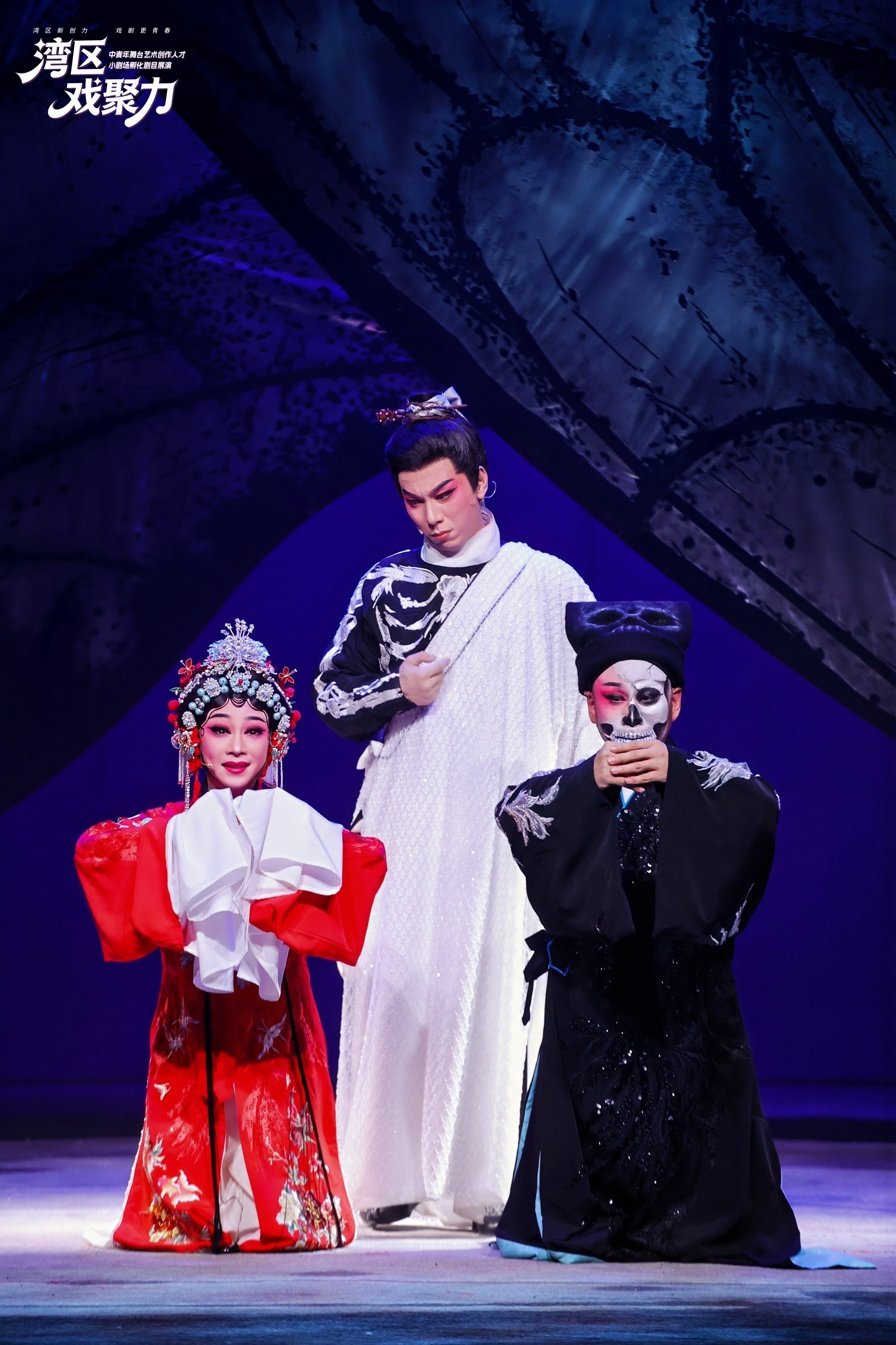 本次展演呈现了广东省剧目策划中心孵化的三部原创小剧场作品,由去年举办的首届“大湾区中青年编剧人才高级培训班”导师们评议推荐,选出来自广州冯敏仪、香港李伟乐、梅州丘晓玲三名学员创作的小剧场粤剧《骷髅叹》、粤语话剧《别来无恙》以及客家山歌剧《废物秀才》,经过近一年的修改打磨与精心筹备,分别由深圳市粤剧团、佛山市演艺中心、梅州市梅县区山歌剧团演艺有限公司排演。作品扎根湾区文化、丰富多元,主创团队均以湾区本土中青年创作人才为主体,以鲜明的实验性精神探索小剧场艺术的多元可能,集中展现了大湾区中青年舞台艺术人才队伍的创作活力与时代风貌。粤剧《骷髅叹》以创新性舞台为载体,对庄子思想展开探索性演绎,解构传统戏曲的叙事范式与观演关系,借助非线性叙事与虚拟化的戏曲空间,在打破舞台的物理边界的同时,巧妙融入流行文化元素,拉近戏曲与观众的距离,呼应当代价值观念和审美意趣,展开一场对存在本身的哲学思辨与深刻对话。