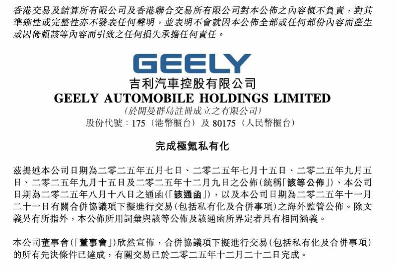 12月22日晚,吉利汽车(00175.HK)发布公告,宣布已正式完成极氪智能科技控股有限公司(以下简称“极氪”)的私有化及合并交易。至此,极氪成为吉利汽车的间接全资附属公司,并从纽交所退市,而今年5月吉利提出的收购极氪全部已发行股份、推动其私有化退市的计划,历经7个月正式落地,“一个吉利”战略进入收官阶段。