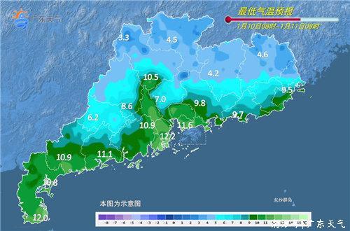 11日,我省大部晴间多云。最低气温:粤北、珠三角北部市县4~7℃,珠三角沿海市县和粤西沿海市县11~13℃,其余市县8~10℃。